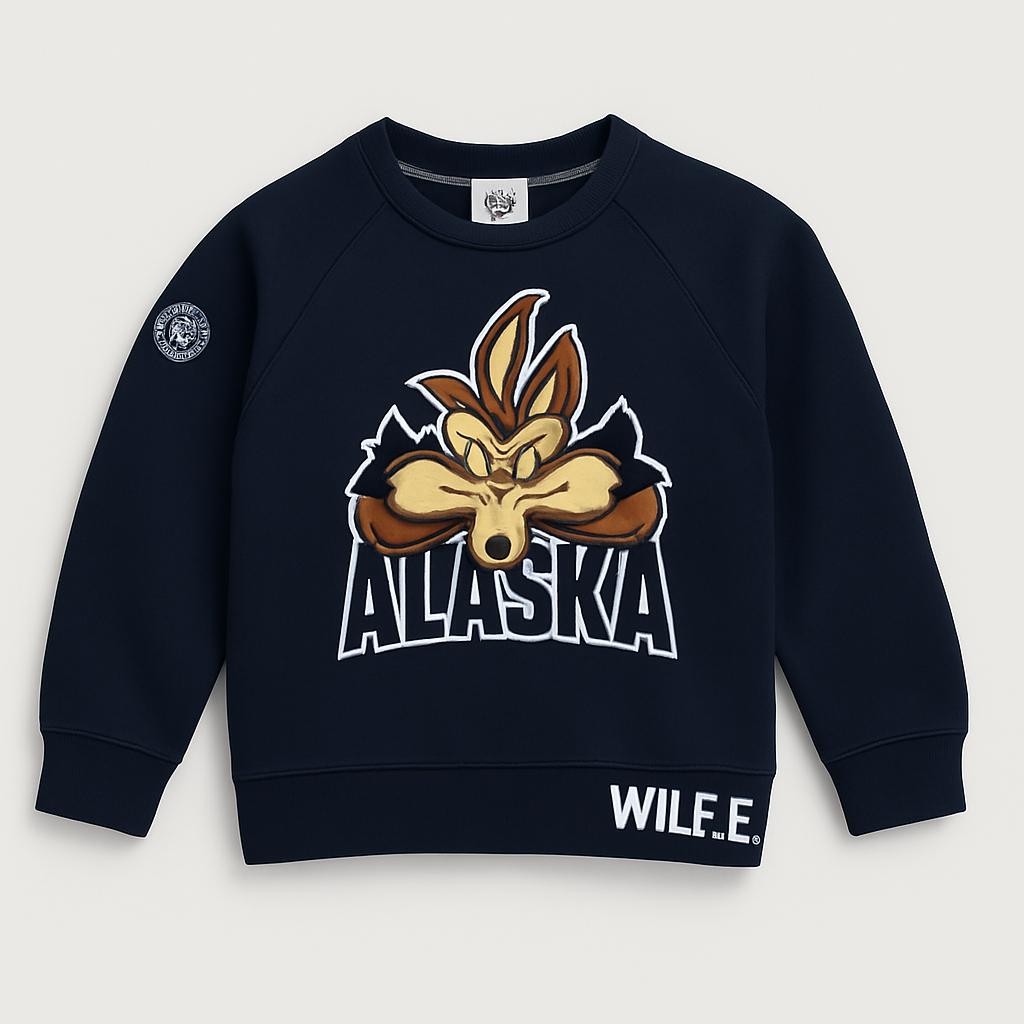 Questo adorabile maglione in blu scuro è perfetto per i piccoli amanti dei cartoni animati! Decorato con un vivace disegno di Wile E. Coyote, porta un tocco di brio al guardaroba di ogni bambino. Il collo a giro e le maniche lunghe garantiscono comfort e calore nelle giornate fresche, mentre il logo "ALASKA" sul davanti aggiunge un elemento di avventura. Nonostante sia un capo usato, si presenta in ottime condizioni, pronto a far divertire il tuo piccolo in qualsiasi occasione. Ideale per una giornata di gioco o per un look casual e di tendenza!