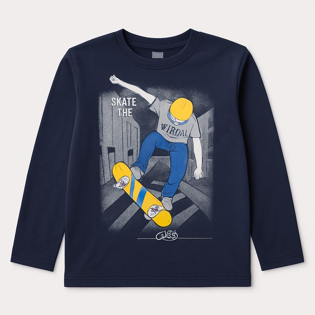 Questa t-shirt a maniche lunghe è perfetta per i piccoli amanti dello skateboard! Realizzata in un morbido cotone blu scuro, presenta una grafica accattivante di un giovane skater in azione. I toni vivaci e l'illustrazione urban trasmettono un'energia contagiosa, ideale per giocattoli e avventure all'aperto. Nonostante sia un capo usato, è in ottime condizioni e pronta a fare brillare il look del tuo bimbo. Con il suo taglio comodo, è perfetta per essere indossata tutti i giorni, sia per la scuola che per il gioco! Un must-have per ogni piccolo straordinario!