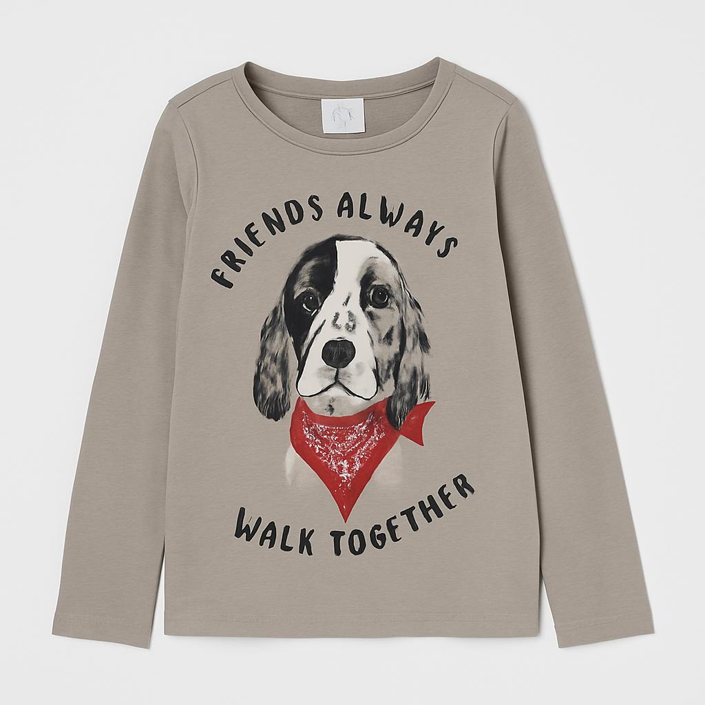 Questa adorabile maglietta a maniche lunghe è perfetta per i piccoli amanti degli animali! Realizzata in morbido cotone, il suo delicato colore grigio si sposa con un grazioso motivo di un cane che indossa un fazzoletto rosso. La frase “Friends always walk together” aggiunge un messaggio di amicizia, rendendo questo capo ancora più speciale. Ideale per le giornate fresche e perfetta per creare outfit comodi e alla moda, questa maglietta usata è in ottime condizioni, pronta per essere indossata da un piccolo esploratore! Un must per il guardaroba!