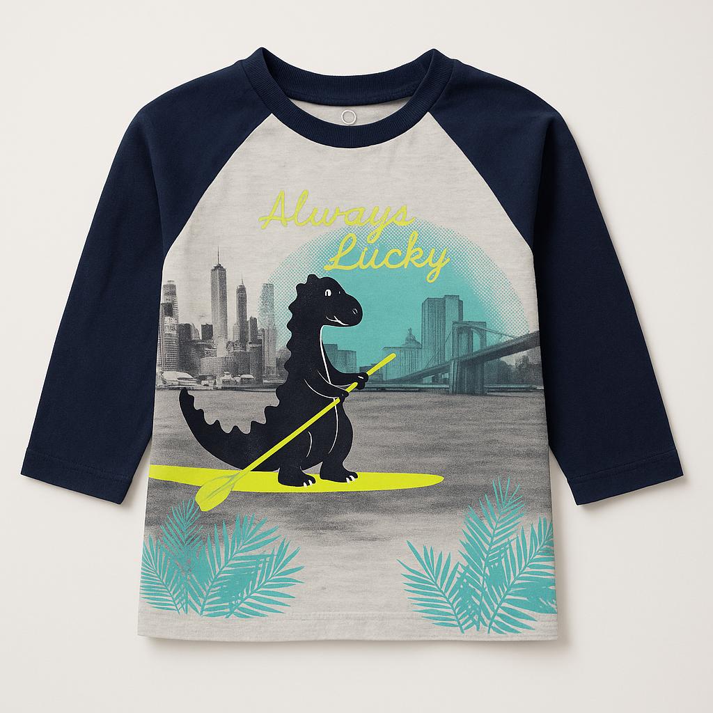 Questa simpatica maglietta a maniche lunghe offre un look divertente e avventuroso per i piccoli esploratori! Realizzata in morbido cotone, è caratterizzata da un adorabile design che raffigura un dinosauro pronto a sfidare le onde. La combinazione di colori blu navy e verde acquamarina dona freschezza e vivacità al guardaroba. Perfetta per le fresche giornate primaverili o per le serate estive, questa maglietta è pratica e alla moda, ideata per garantire comfort durante il gioco. Nonostante sia un capo usato, si presenta in buone condizioni, pronta a far sorridere il tuo piccolo!