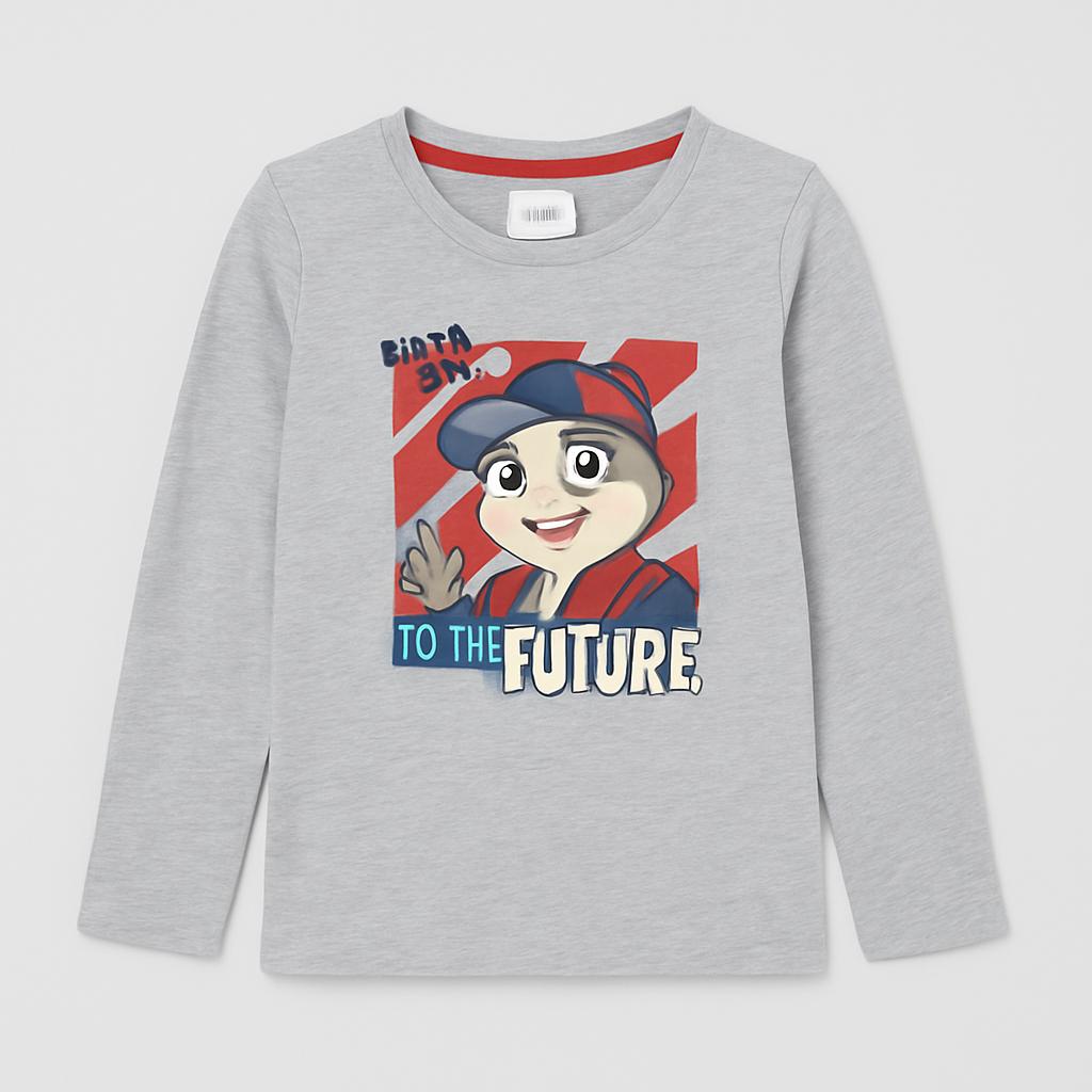 Questa simpatica maglietta a maniche lunghe è perfetta per i piccoli sognatori! Realizzata in un morbido tessuto grigio melange, è decorata con un divertente graphic che invita a "Andare nel Futuro". I colori vivaci e il personaggio giocoso la rendono irresistibile per ogni bambino. Le maniche lunghe sono ideali per le giornate fresche, mentre il taglio comodo assicura libertà di movimento. Nonostante sia un capo usato, è in ottime condizioni e pronta a dare un tocco di allegria al guardaroba dei più piccoli!