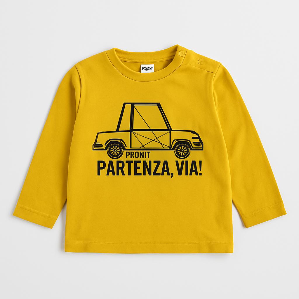 Questa vivace t-shirt gialla è perfetta per i piccoli appassionati di avventure! Con il suo design allegro, presenta una stampa nera che recita "PRONTI... PARTENZA, VIA!" accompagnata da un simpatico disegno di un'auto. Le maniche a sbuffo conferiscono un tocco trendy, rendendola ideale per ogni occasione, dai giochi all'aperto alle giornate più tranquille. Realizzata in morbido cotone, è confortevole e pratica. Anche se usata, si presenta in ottime condizioni, pronta a portare un sorriso sul volto del tuo piccolo!