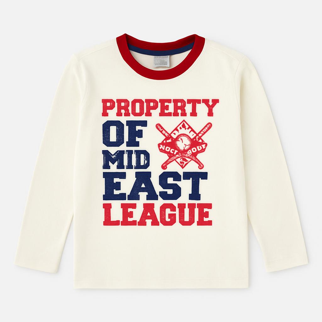 Questo simpatico maglione a maniche lunghe è perfetto per i piccoli campioni! Realizzato in morbido cotone beige, è caratterizzato da un vivace girocollo rosso e una stampa giocosa che celebra il mondo del baseball con le scritte "PROPERTY OF MID EAST LEAGUE". Ideale per le giornate più fresche, si abbina facilmente a jeans o pantaloni comodi. Nonostante sia un capo usato, è in ottime condizioni e pronto a dare avvio a nuove avventure! Un must per i piccoli sportivi in erba!