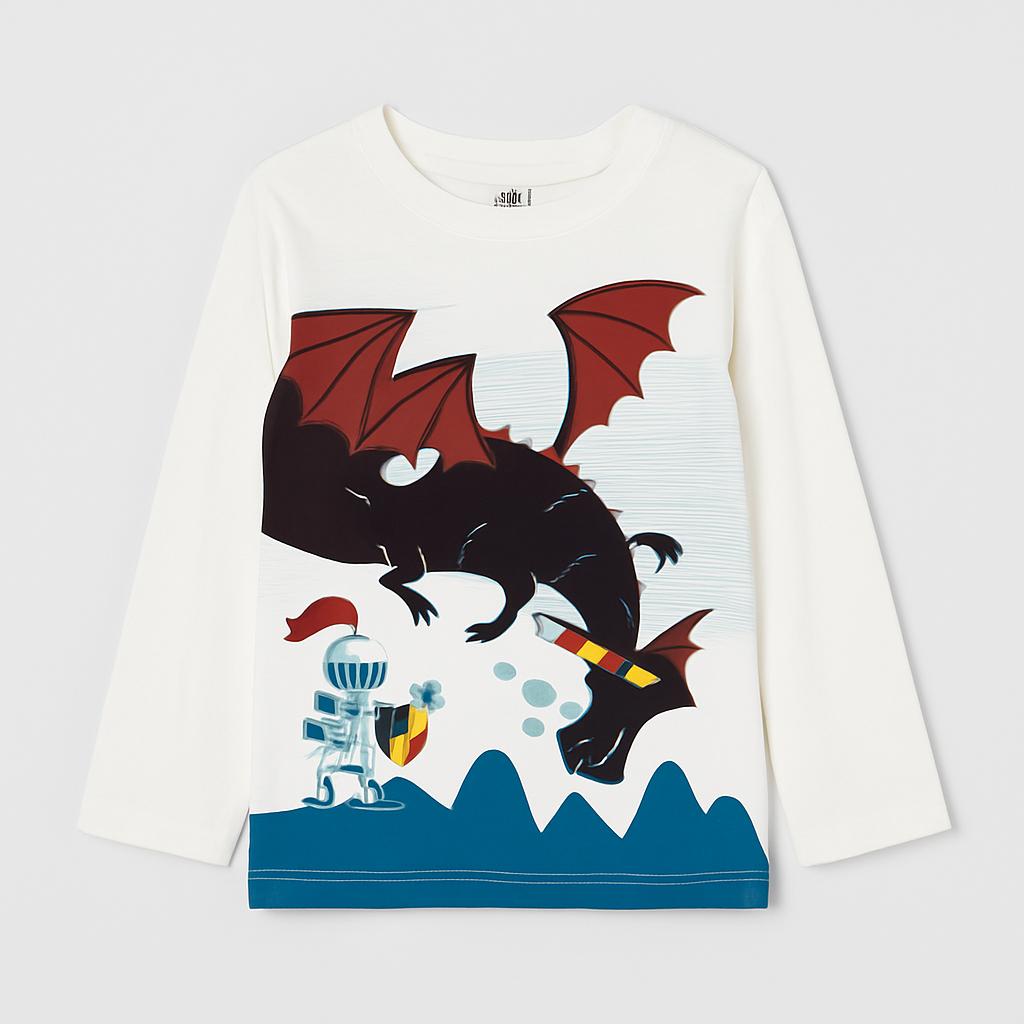 Questa maglietta a maniche lunghe è perfetta per i piccoli sognatori! Realizzata in una morbida fibra di cotone, presenta un affascinante design che racconta storie di cavalieri e draghi. Il bianco di base mette in risalto la scenografia colorata: un temibile drago e un coraggioso cavaliere, pronti per un'avventura epica! Con il suo taglio comodo, è ideata per garantire libertà di movimento durante le esplorazioni quotidiane. Anche se si tratta di un capo usato, si trova in buone condizioni e sarà un'aggiunta divertente al guardaroba del tuo piccolo avventuriero!