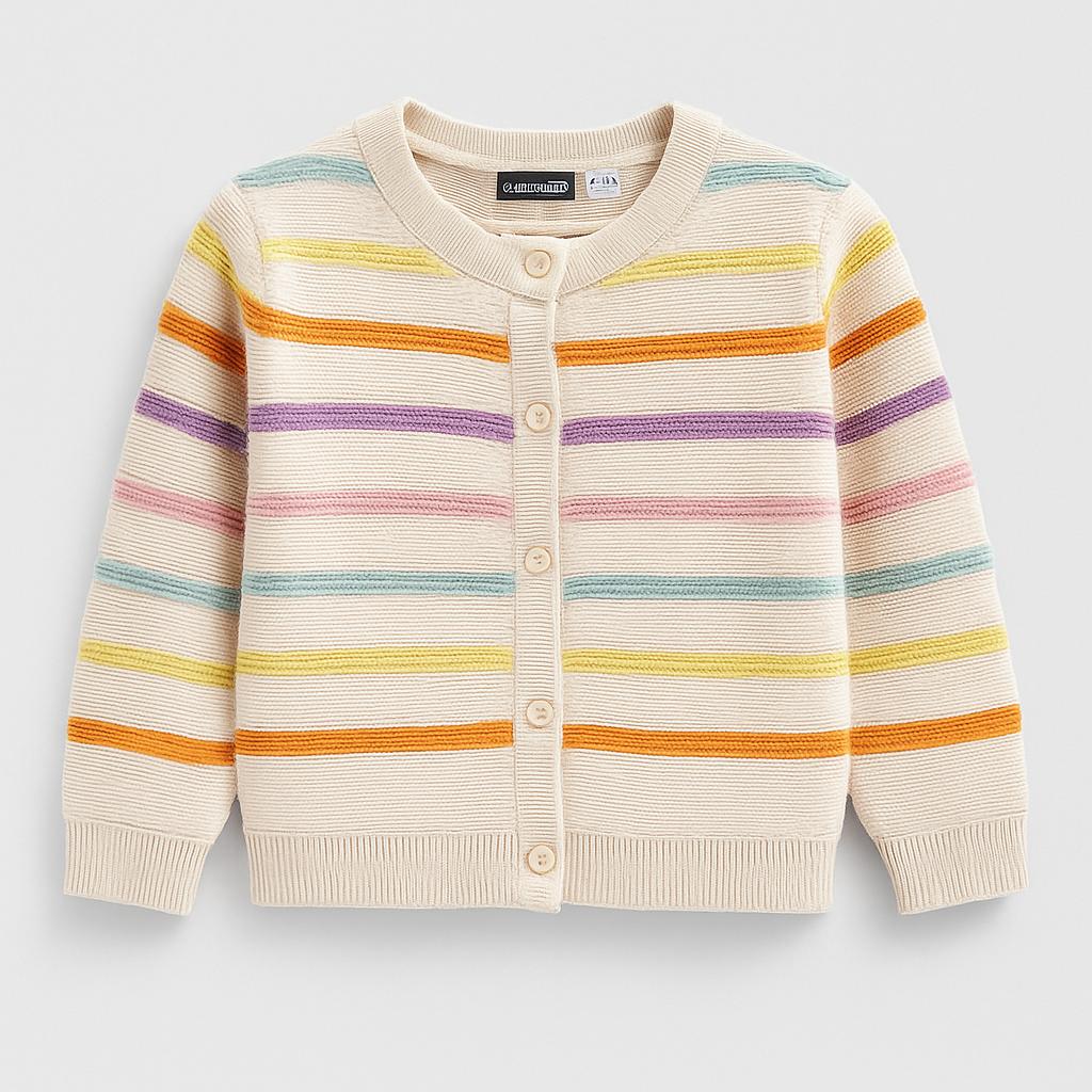 Questo adorabile cardigan a righe è perfetto per le piccole fashioniste! Realizzato in un caldo materiale, il pullover presenta una dolce combinazione di colori pastello che porterà un arcobaleno nel guardaroba. Le righe gialle, rosa, lavanda e arancioni si intrecciano su uno sfondo bianco, creando un look giocoso e vivace. I bottoni frontali facilitano la vestizione, mentre il taglio comodo assicura libertà di movimento per giochi e avventure. Anche se usato, si presenta in ottime condizioni ed è pronto per avvolgere in calore e stile le tue piccole! Un capo versatile, perfetto per le fresche giornate primaverili!