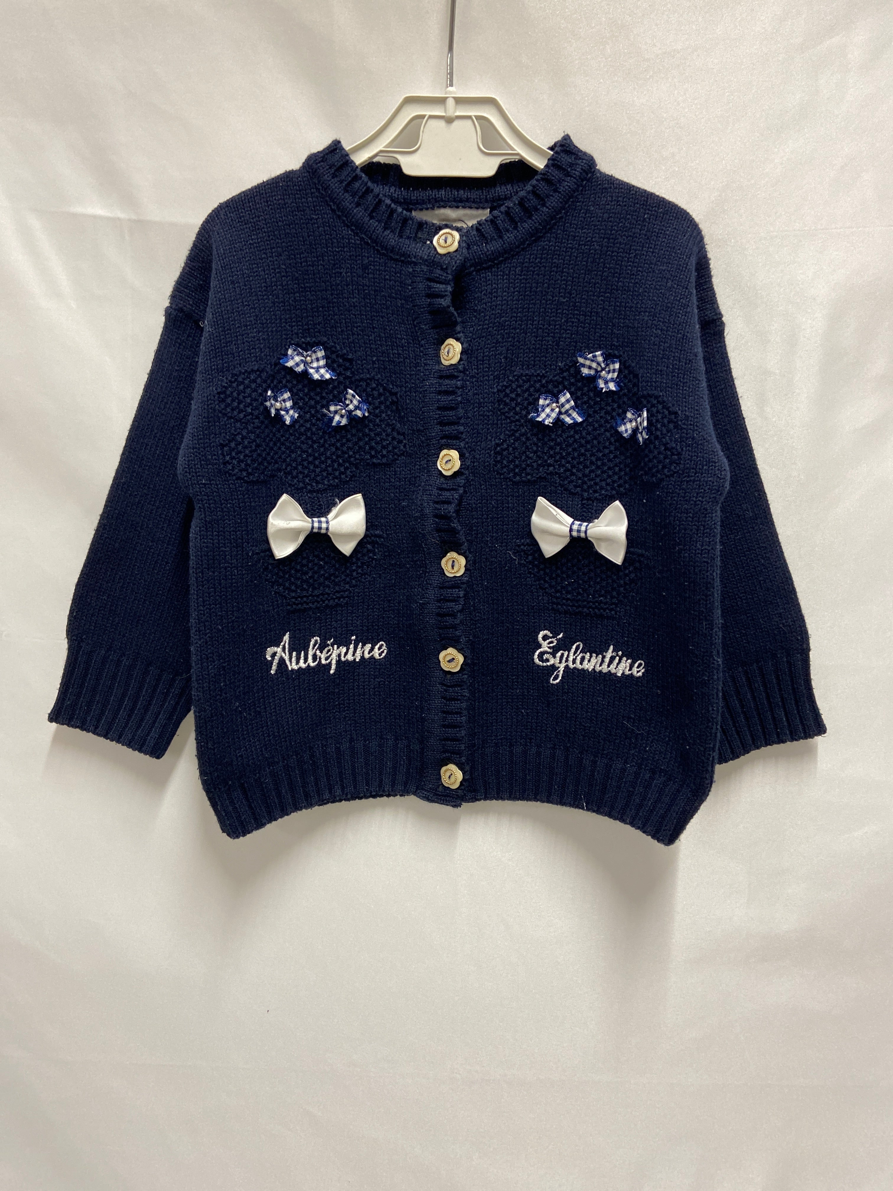 Questo delizioso cardigan navy è perfetto per aggiungere un tocco di eleganza al guardaroba dei più piccoli! Realizzato in un morbido filato, presenta graziosi fiocchetti bianchi e delicate applicazioni floreali che cattureranno l'attenzione. Il pratico design con bottoni facilita la vestibilità e rende questo capo ideale per le fresche giornate primaverili o autunnali. Nonostante sia un modello usato, si presenta in ottime condizioni, pronto per accompagnare le avventure quotidiane con stile! Una scelta ideale per le piccole fashioniste che amano sentirsi speciali e a loro agio!