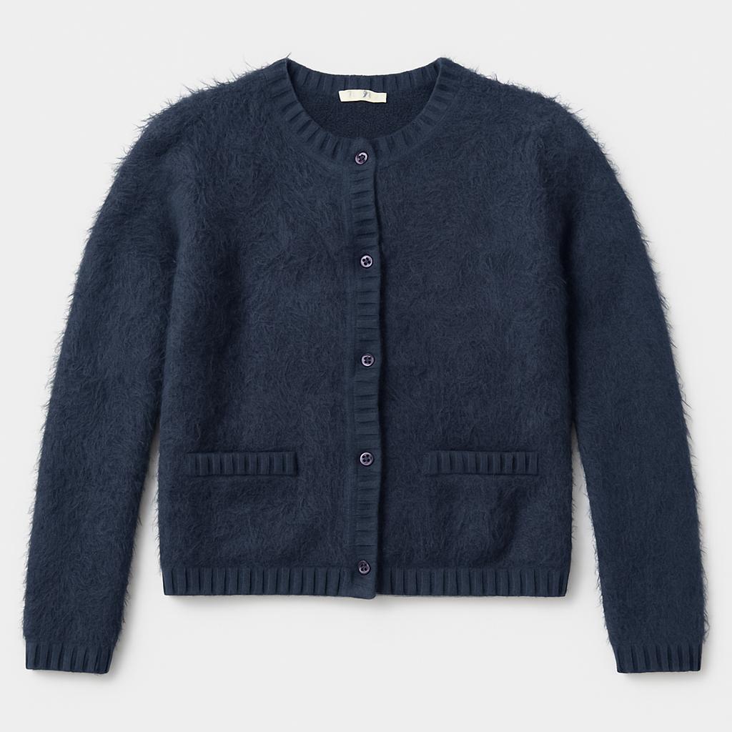Avvolgi il tuo piccolo in un abbraccio di morbidezza con questo cardigan vintage! Realizzato in un caldo e accogliente tessuto peloso di un elegante blu scuro, questo capo è perfetto per le giornate fresche. I dettagli raffinati, come le simpatiche tasche anteriori e i bottoni colorati, aggiungono un tocco di stile divertente. Con un design comodo e pratico, è ideale da indossare su una maglietta o per completare un look casual. Nonostante sia usato, si presenta in ottime condizioni, pronto a diventare il nuovo preferito del tuo piccolo! Perfetto per ogni piccola avventuriera che ama sentirsi coccolata e alla moda!