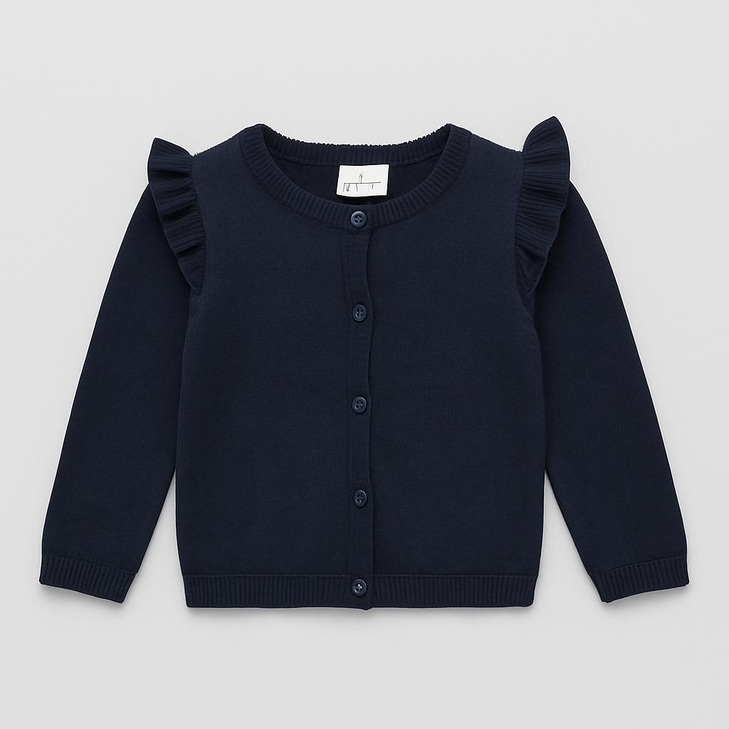 Questo adorabile cardigan in lana di un elegante blu notte è perfetto per tenere al calduccio la tua piccola! Caratterizzato da delicati volant sulle maniche, aggiunge un tocco di femminilità e stile. I bottoni frontali rendono facile e veloce l'apertura e la chiusura, ideale per le mamme sempre in movimento. Perfetto da abbinare a una t-shirt colorata o a un vestitino, questo capo usato si presenta in ottime condizioni ed è l'aggiunta ideale per il guardaroba delle piccole trendsetter!