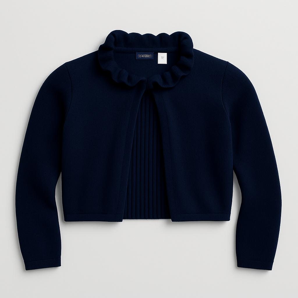 Questo delizioso cardigan in lana di colore blu navy è perfetto per completare il look della tua piccola. La sua lavorazione a coste e il colletto arricciato aggiungono un tocco di eleganza e femminilità. Le maniche lunghe garantiscono comfort e calore, rendendolo ideale per le fresche giornate autunnali o primaverili. Anche se è un capo usato, si presenta in ottime condizioni e pronta per accompagnare la tua bimba in tutte le sue avventure. Un must-have per dare un tocco chic a qualsiasi outfit!