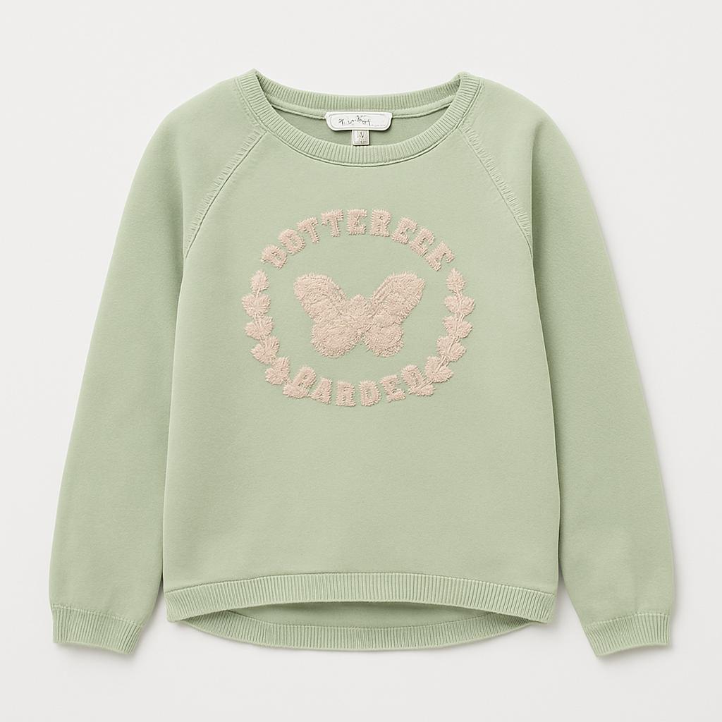 Questo adorabile maglione verde menta è perfetto per le piccole sognatrici! Realizzato in un morbido materiale, offre comfort e calore durante le giornate più fresche. Il suo design è arricchito da un'esclusiva applicazione floreale "Butterfly Garden" sulla parte anteriore, che aggiunge un tocco di magia e originalità. Le maniche lunghe e il taglio leggermente svasato lo rendono versatile, adatto sia per una passeggiata nel parco che per un pomeriggio di giochi a casa. Nonostante sia un capo usato, si trova in ottime condizioni e garantirà un look trendy e coccoloso a ogni piccola avventuriera!