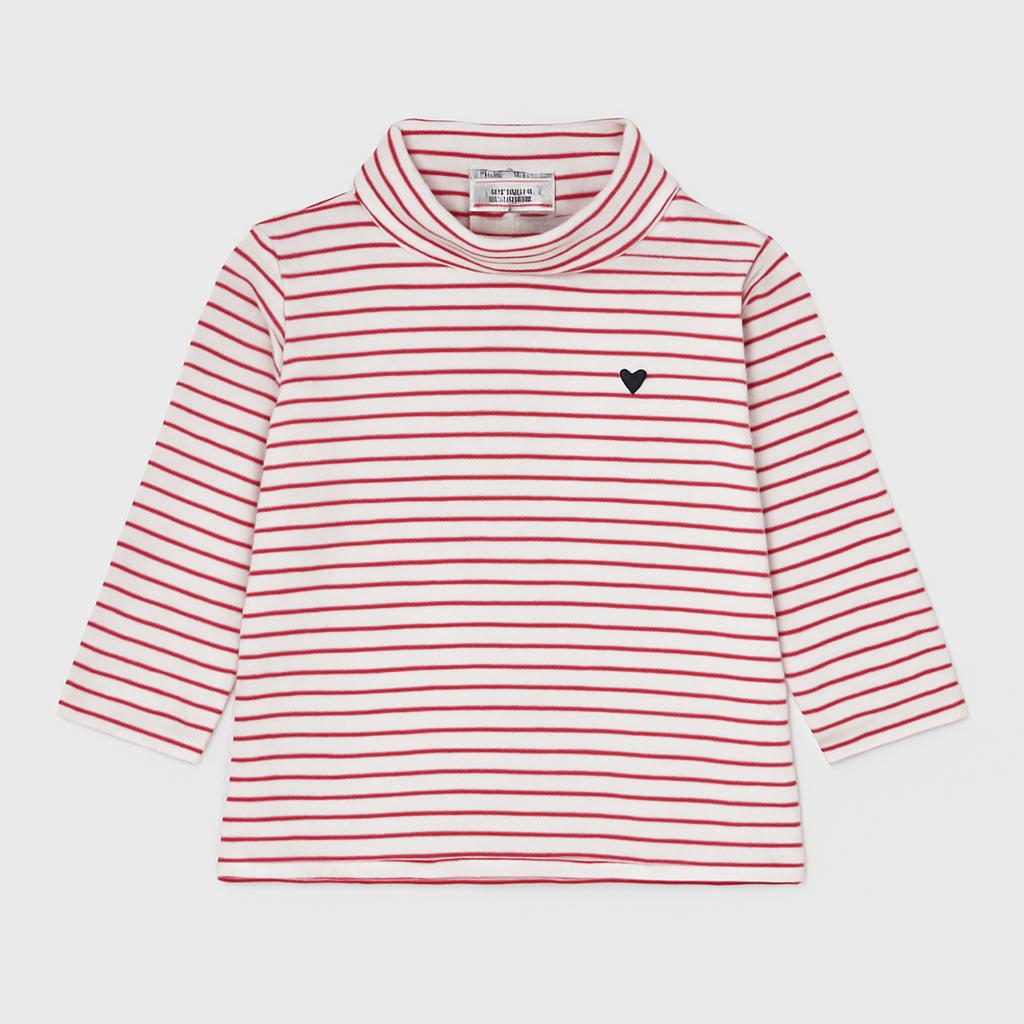 Questa charmant maglietta a righe è un vero must-have per il guardaroba dei più piccoli! Realizzata in morbido tessuto, offre comfort e stile in ogni occasione. Le righe bianche e rosse donano un tocco vivace, mentre il colletto alto aggiunge un pizzico di eleganza e originalità. La piccola applicazione a forma di cuore sul petto regala un dettaglio speciale che conquisterà i cuori. Ideale da abbinare a jeans o pantaloni, è perfetta per le avventure quotidiane o le giornate casual. Anche se usata, si presenta in ottime condizioni ed è pronta a diventare il nuovo preferito del tuo piccolo!