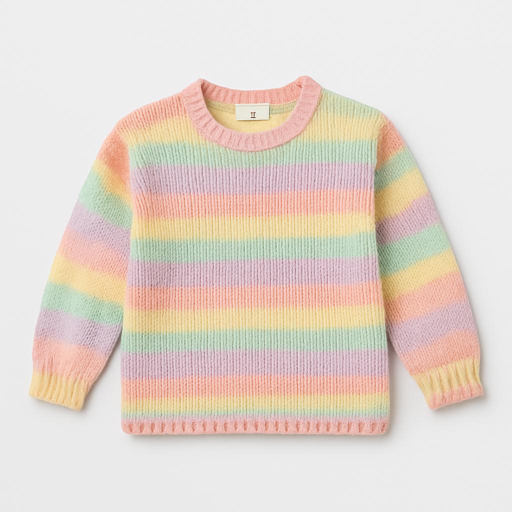 Questo maglione coloratissimo è un vero arcobaleno di dolcezza per il guardaroba dei più piccini! Realizzato in morbido filato, presenta un allegro motivo a righe nei toni pastello di rosa, giallo, verde e azzurro, perfetto per portare un sorriso nei giorni più freddi. Le maniche a sbuffo e il taglio comodo lo rendono ideale per giocare in libertà o per una passeggiata all'aria aperta. Nonostante sia usato, si presenta in ottime condizioni e sarà un indumento caldo e trendy per ogni piccola fashionista! Un capo che unisce comfort e stile in modo simpatico e vivace!
