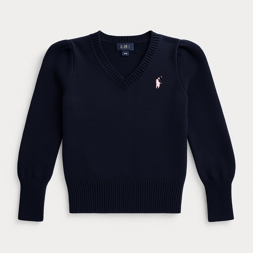 Questo elegante maglione di marca Ralph Lauren è perfetto per le piccole fashioniste! Realizzato in morbido cotone di colore blu scuro, presenta un delicato scollo a V e maniche a palloncino che conferiscono un tocco di stile unico. La graziosa piccola polo logo sul petto aggiunge un elemento distintivo e chic. Ideale per le giornate più fresche, questo capo offre comfort e classe, rendendolo perfetto da abbinare a jeans o gonne. Nonostante sia usato, si presenta in ottime condizioni, pronto per arricchire il guardaroba della tua piccola!
