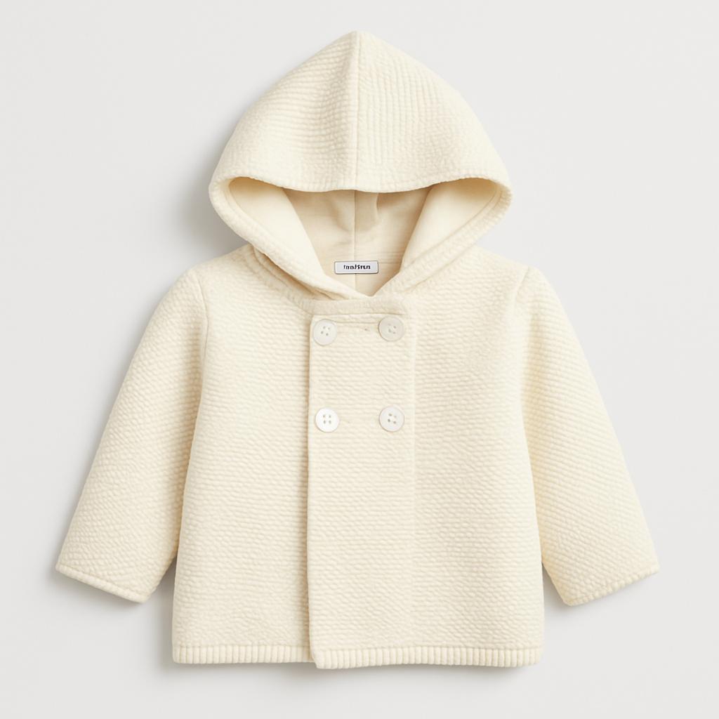 Questo adorabile cappotto di maglia bianco crema è perfetto per le giornate fresche! Realizzato con un morbido tessuto, offre comfort e calore. Il design con cappuccio e i bottoni decorativi sul davanti aggiungono un tocco raffinato e giocoso. Le maniche lunghe garantiscono protezione e comodità durante le avventure invernali. Nonostante sia un capo usato, si presenta in ottime condizioni, pronto a donare un look elegante e coccoloso al tuo bimbo. Un must-have per ogni piccolo esploratore!