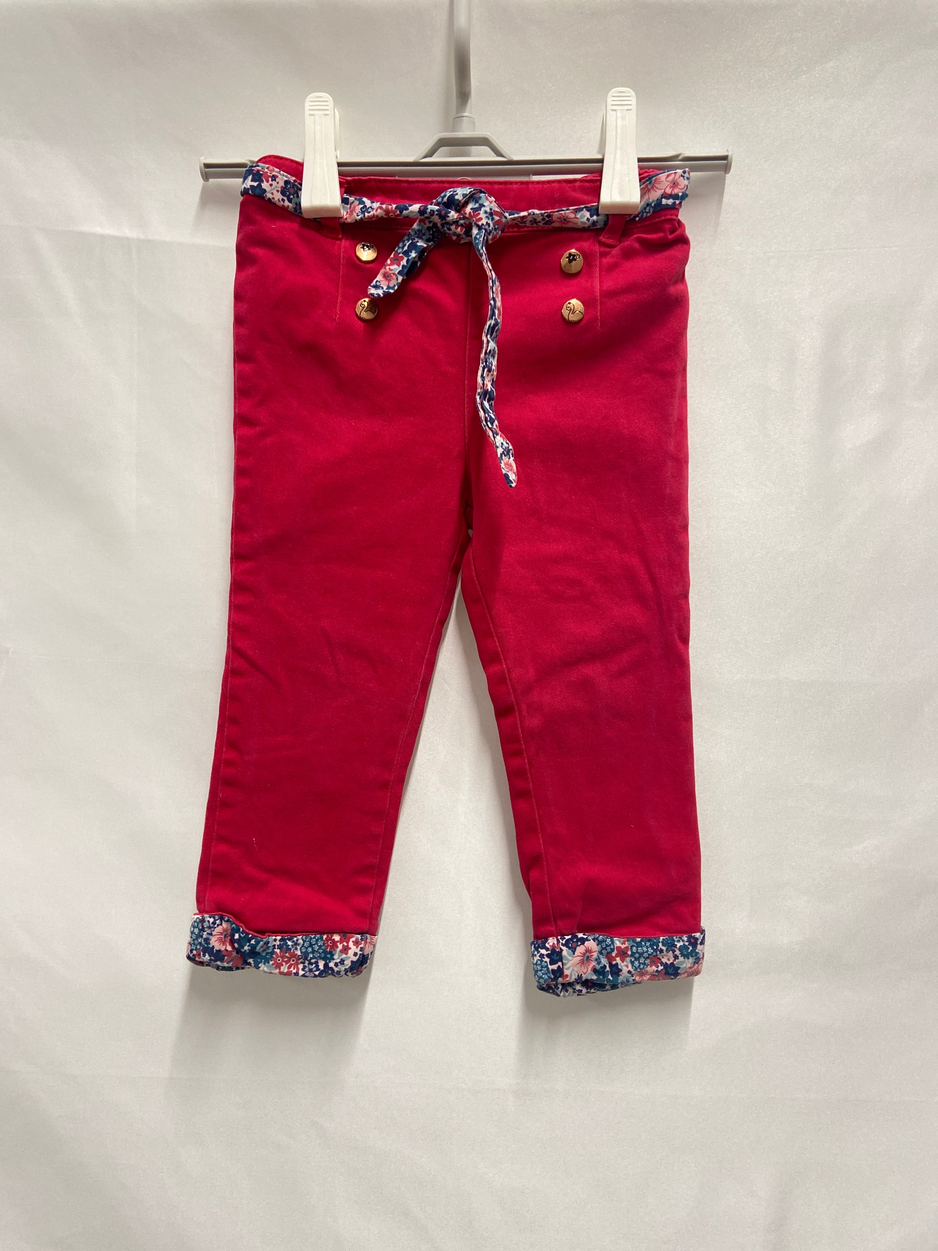 Questi adorabili pantaloni skinny in un vivace rosso fucsia sono un'aggiunta fantastica al guardaroba della tua piccola! Realizzati in cotone morbido e confortevole, presentano una fascia in vita regolabile con un pratico cordoncino e bottoni dorati che aggiungono un tocco elegante. I bellissimi orli a fantasia floreale donano un tocco delicato e giovanile, rendendoli perfetti per ogni occasione, da una giornata al parco a un compleanno. Nonostante siano usati, sono in ottime condizioni e pronti a essere indossati da una piccola esploratrice! Un capo trendy e versatile che ogni bambina adorerà!