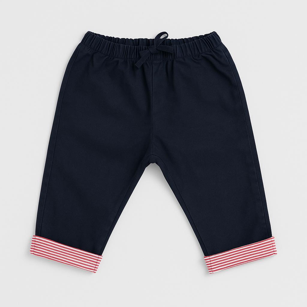 Questi pantaloni comodi e alla moda sono un'ottima aggiunta al guardaroba del tuo bambino! Realizzati in un fresco cotone di colore blu scuro, presentano un taglio alla caviglia che permette massima libertà di movimento. L'interno del bordo arrotolato è caratterizzato da righe rosse e bianche, aggiungendo un divertente tocco di stile. Con una vita elastica regolabile, assicurano comfort e praticità, perfetti per le avventure quotidiane o per un pomeriggio di gioco. Nonostante siano usati, sono in ottime condizioni e pronti per essere indossati da un piccolo esploratore!