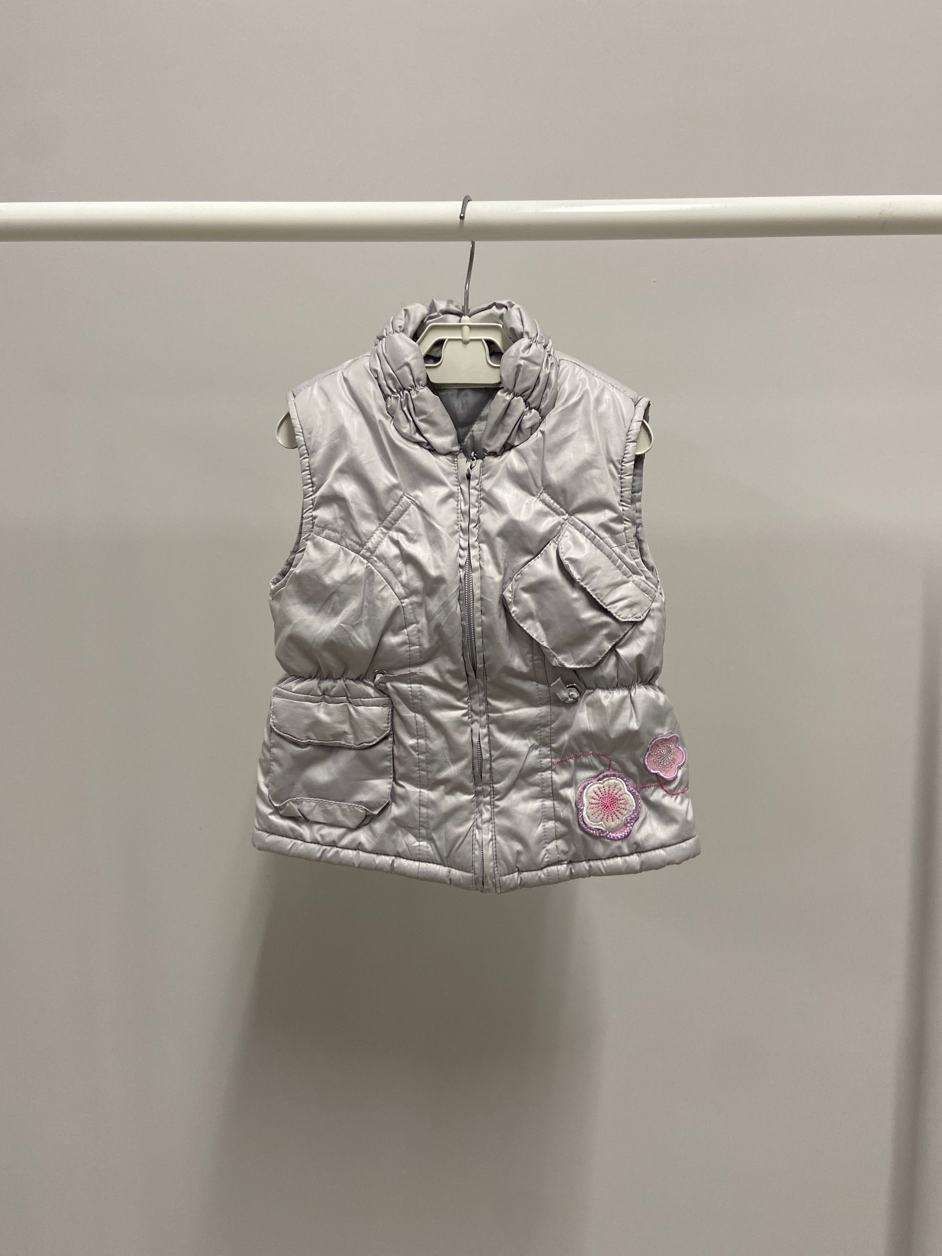 Questo favoloso gilet imbottito grigio è l'aggiunta perfetta per il guardaroba dei piccoli avventurieri! Realizzato in un morbido materiale, presenta un design pratico con tasche frontali per riporre tesori preziosi. Le cuciture decorative e i dettagli floreali in rosa donano un tocco di allegria e un pizzico di stile. Con un colletto alto, il gilet tiene al caldo durante le fresche giornate autunnali. Usato ma in ottime condizioni, rappresenta un'opzione versatile per outfit casual o per le avventure all'aperto! Un capo essenziale per ogni piccolo esploratore!
