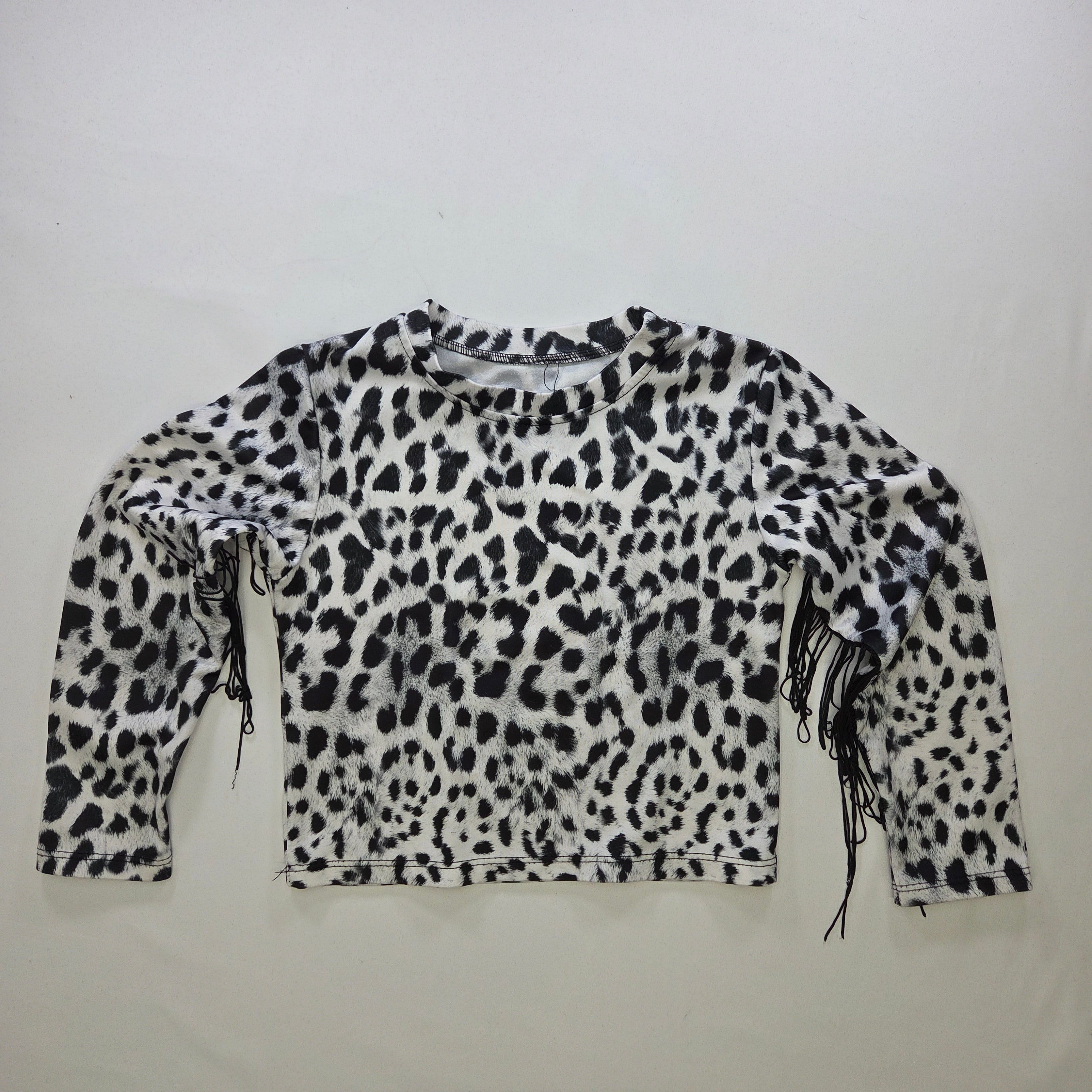 Questo originale maglione a maniche lunghe è perfetto per le piccole amanti del mettere in mostra il proprio stile unico! Caratterizzato da un audace motivo leopardato in bianco e nero, aggiunge un tocco di wild fashion al guardaroba. Le frange laterali donano movimento e un pizzico di freschezza, rendendolo ideale per ogni avventura. Realizzato in un morbido tessuto, garantisce comfort e calore durante i giorni più freschi. Nonostante sia un capo usato, appare in buone condizioni e pronto per essere indossato da una piccola trendsetter!