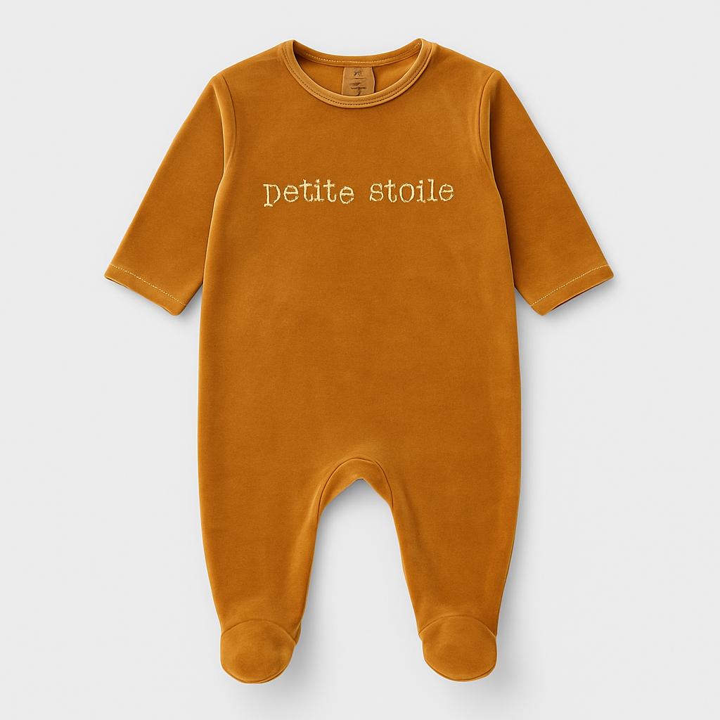 Questo adorabile pagliaccetto in morbido velluto è perfetto per coccolare il tuo piccolo! Di un caldo e accogliente colore ocra, è impreziosito dalla scritta "petite étoile" sul petto, che aggiunge un tocco di poesia. Con maniche lunghe e piedini integrati, offre comfort e protezione nelle giornate fresche. Ideale per lounge e giochi, questo capo usato è in ottime condizioni e pronto a diventare il preferito nel guardaroba del tuo bambino. Un must-have per ogni piccola stella!
