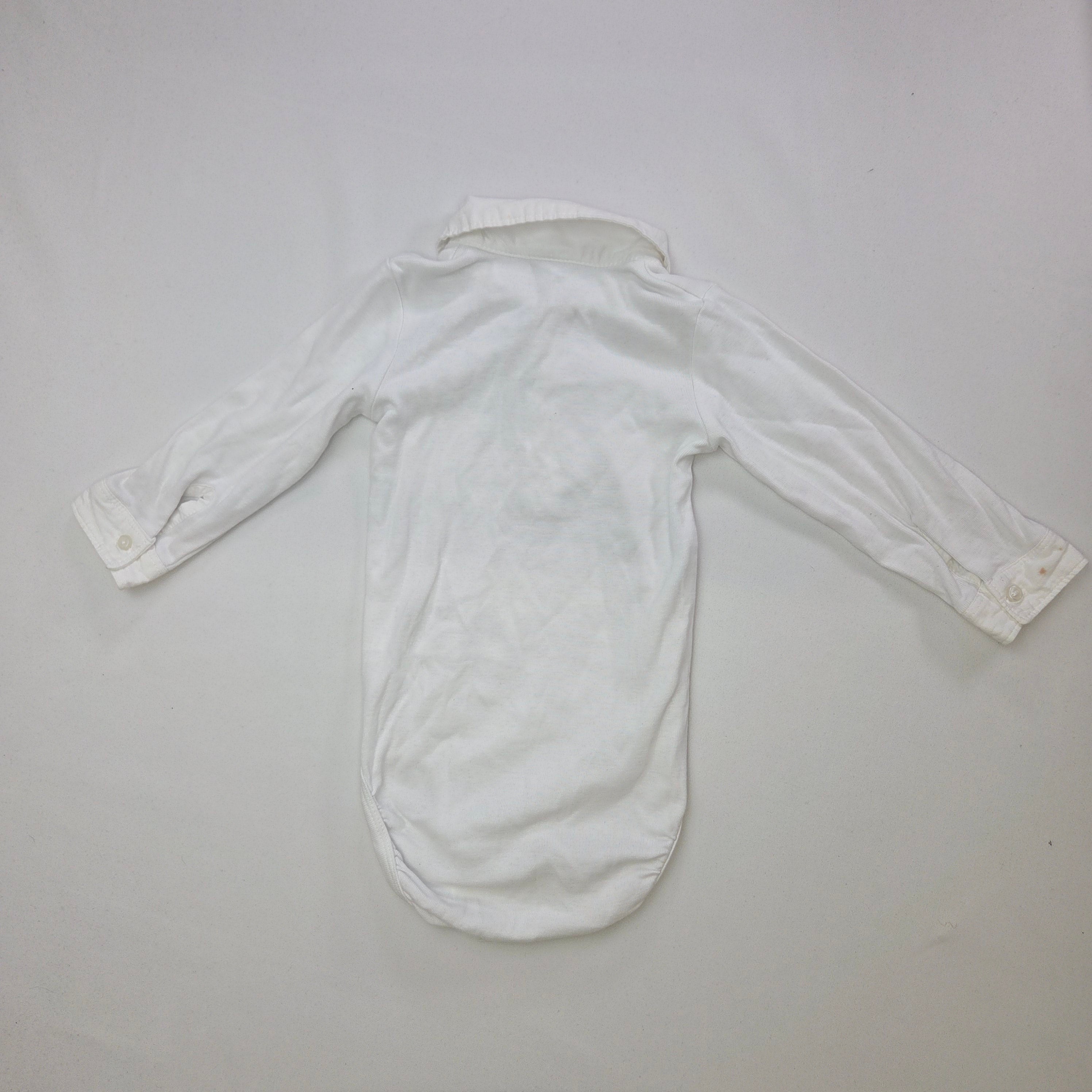 Questo adorabile body bianco a maniche lunghe è un must-have per il guardaroba del tuo piccolo! Realizzato in morbido cotone, offre comfort e libertà di movimento, perfetto per le avventure quotidiane. Il colletto classico e i bottoncini sul davanti conferiscono un tocco chic e raffinato, rendendolo ideale per ogni occasione. Nonostante sia un capo usato, si presenta in buone condizioni ed è prontissimo per accompagnare il tuo bambino in ogni momento di gioia e svago. Versatile e facile da abbinare, sarà sicuramente un grande alleato nel look del tuo piccolo!