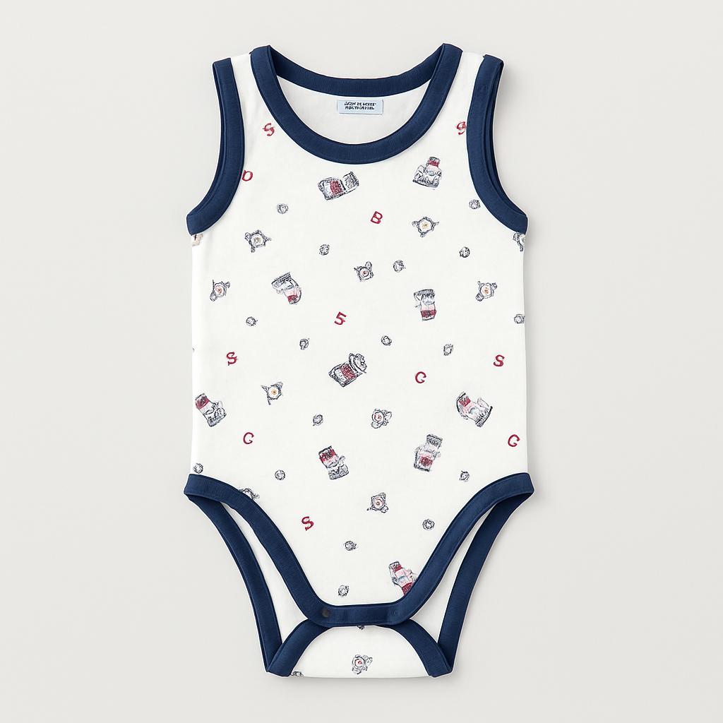 Questo adorabile body per bambini è perfetto per i più piccoli! Realizzato in morbido cotone, offre un comfort eccezionale durante tutta la giornata. Il design bianco è decorato con un simpatico motivo di animaletti che porterà un sorriso sul volto del tuo bimbo. Le spalline e i bordi blu scuro aggiungono un tocco elegante e vivace.