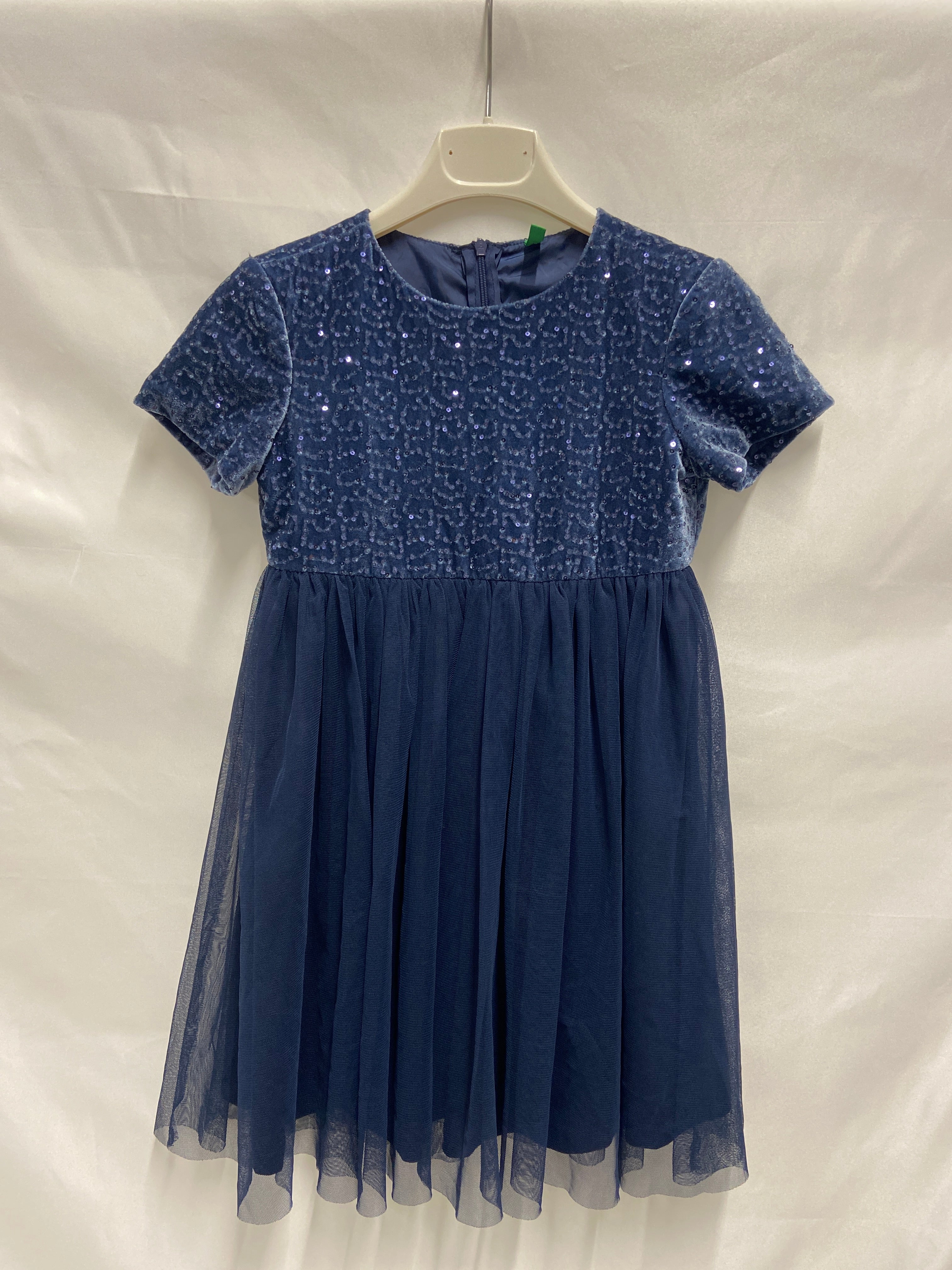 Questo incantevole vestito blu notte è perfetto per le piccole sognatrici! Realizzato in un morbido tessuto, presenta un delizioso corpetto decorato con paillettes che scintillano ad ogni movimento. La gonna in tulle voluminoso aggiunge un tocco di magia, rendendolo ideale per feste, cerimonie o giochi da principessa. Con maniche corte e una chiusura sul retro, è facile da indossare e comodo per la tua piccola avventuriera. Nonostante sia un capo usato, si presenta in ottime condizioni, pronto ad incantare!