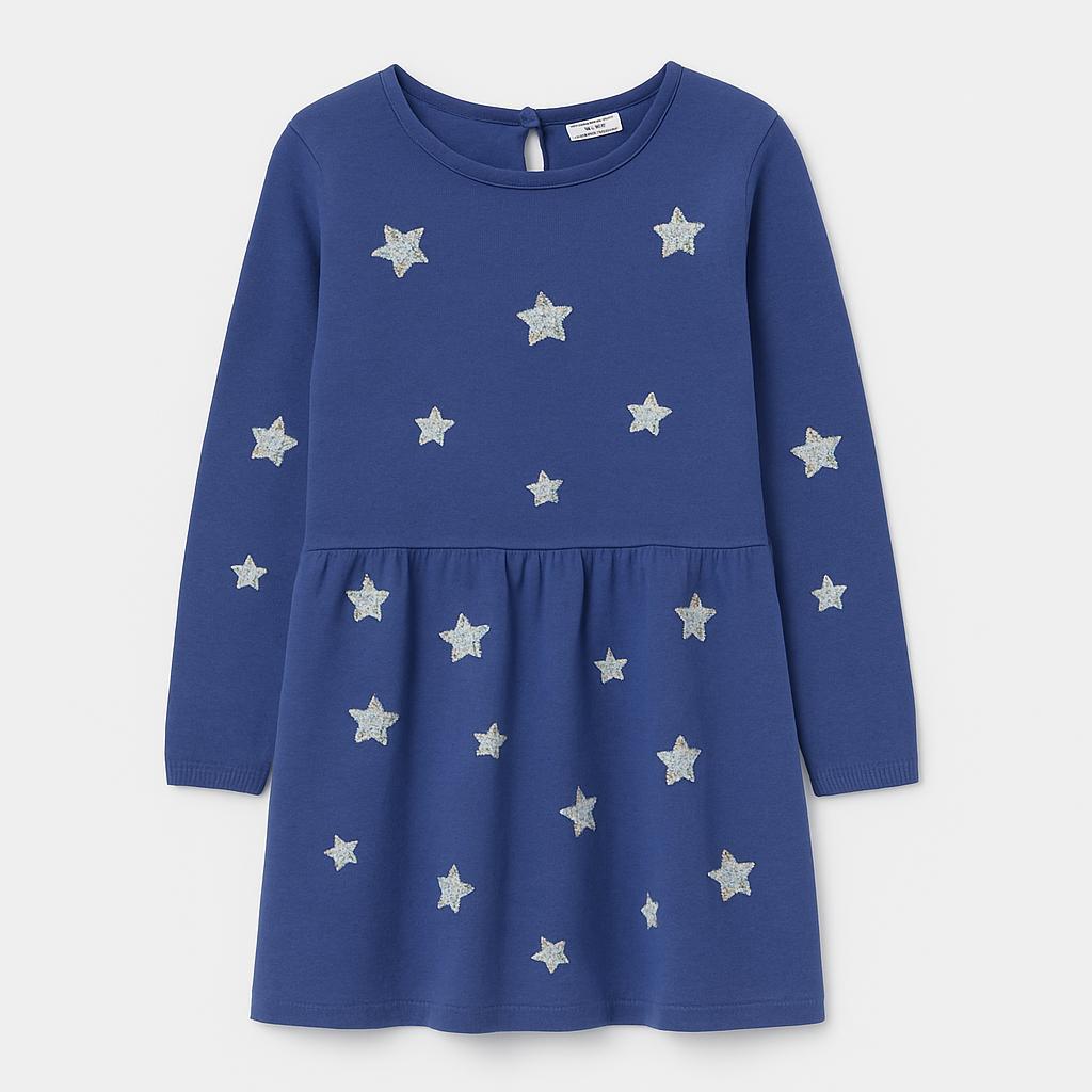 Questa deliziosa vestitino blu scuro è perfetto per far brillare il guardaroba della tua piccola! Realizzato in un morbido cotone, presenta un adorabile motivo di stelle brillanti che aggiunge un tocco magico. Con una comoda gonna a ruota e maniche lunghe, è ideale per ogni avventura, dalle passeggiate nel parco alle feste con gli amici. Nonostante sia un capo usato, si trova in ottime condizioni, pronto a essere indossato da una giovane star! Questo vestitino è un must per le piccole sognatrici!