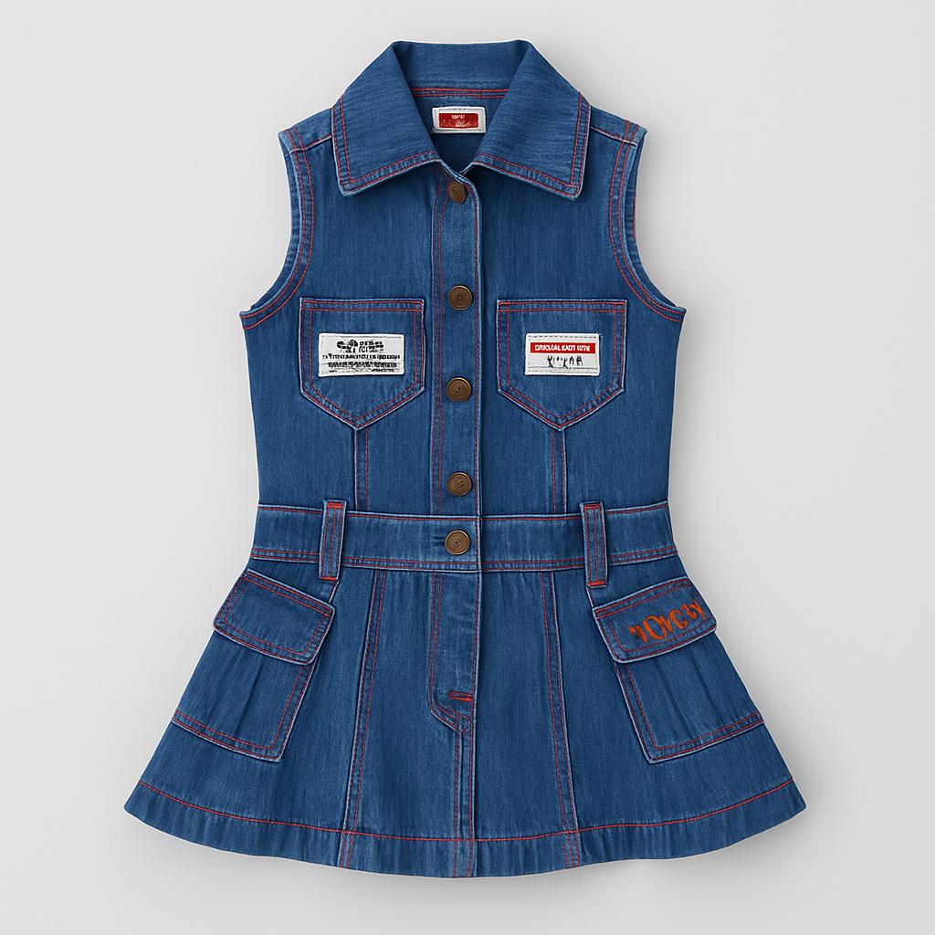 Questo adorabile abito in denim è un vero must-have per le piccole fashioniste! Con un taglio senza maniche e un colletto elegante, il vestito è caratterizzato da un vivace design a pannelli e dettagli ricamati in rosso che lo rendono unico. I bottoni davanti e le tasche aggiungono un tocco pratico, mentre la gonna svasata garantisce movimenti fluidi per giocare e divertirsi. Nonostante sia usato, si presenta in ottime condizioni, pronto a fare brillare il guardaroba della tua bambina in ogni occasione!