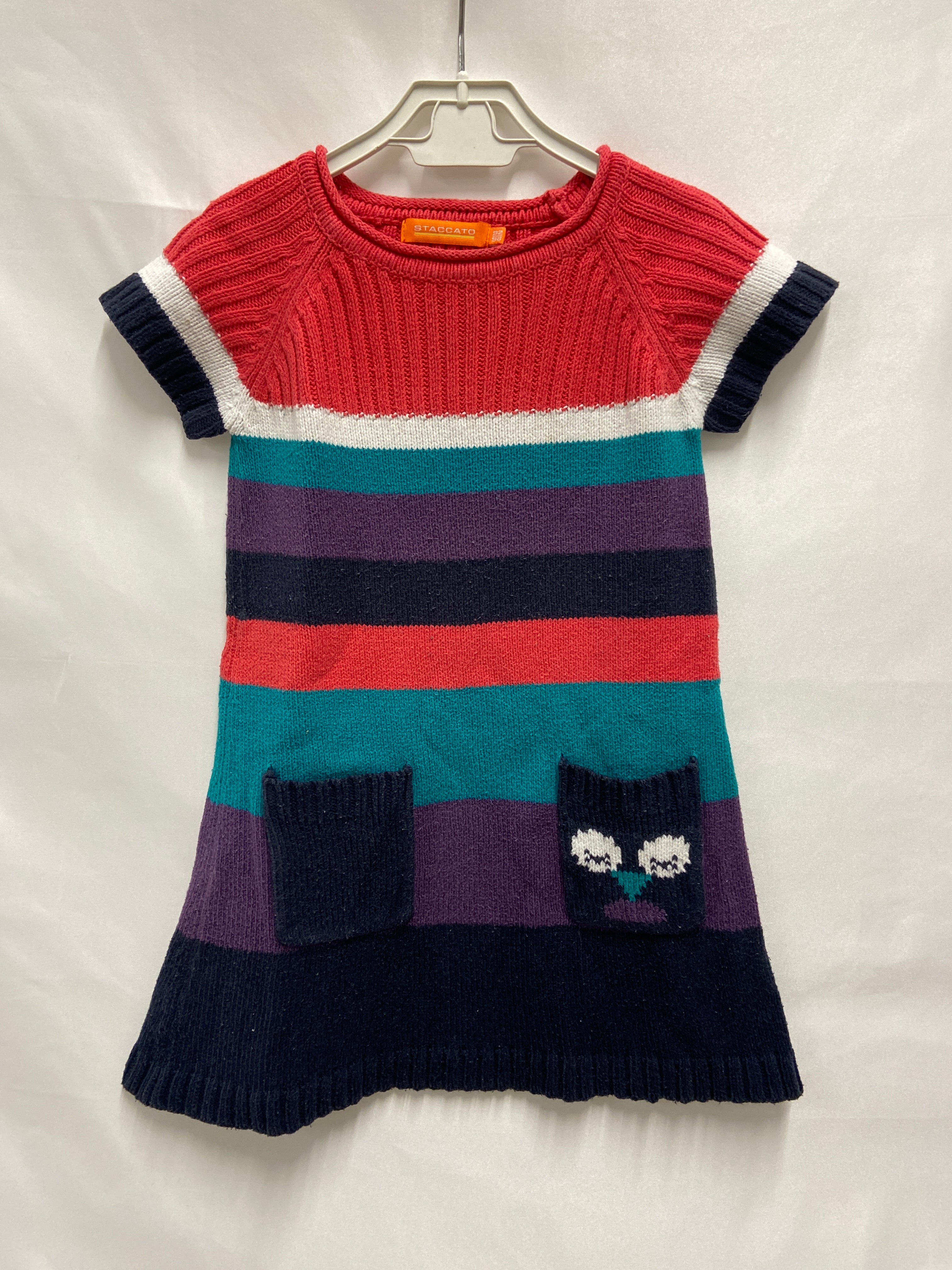 Questo adorabile vestito a righe per bambine è un vero colpo di fulmine! Realizzato in morbido e caldo materiale, il design a righe multicolore, con un sorprendente mix di rosso, blu e verde, porterà un sorriso sul volto della tua piccola. Le maniche corte e lo scollo a girocollo offrono comfort e libertà di movimento, mentre le due graziose tasche con un simpatico gufo ricamato aggiungono un tocco giocoso e originale. Perfetto per una giornata di giochi o per occasioni speciali, questo vestito usato è in ottime condizioni e pronto a diventare il nuovo preferito nel guardaroba di ogni piccola stilista!