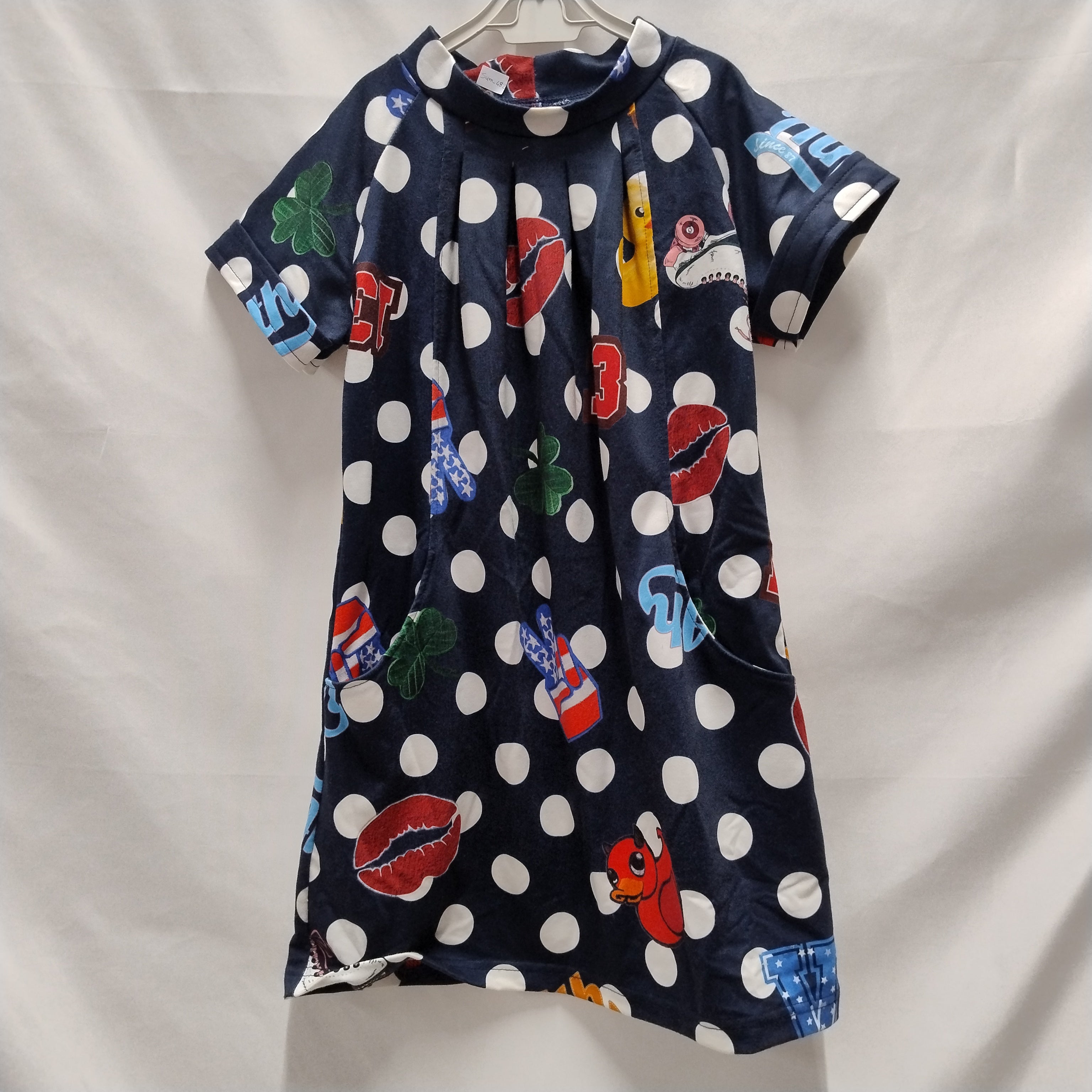 Questo adorabile vestitino a pois è un vero e proprio sogno per le piccole fan della moda! Realizzato in morbido cotone, presenta un divertente mix di colori e fantasie che includono simpatici personaggi e oggetti giocosi. Le grandi pois bianche sullo sfondo blu donano un tocco frizzante e vivace al look.