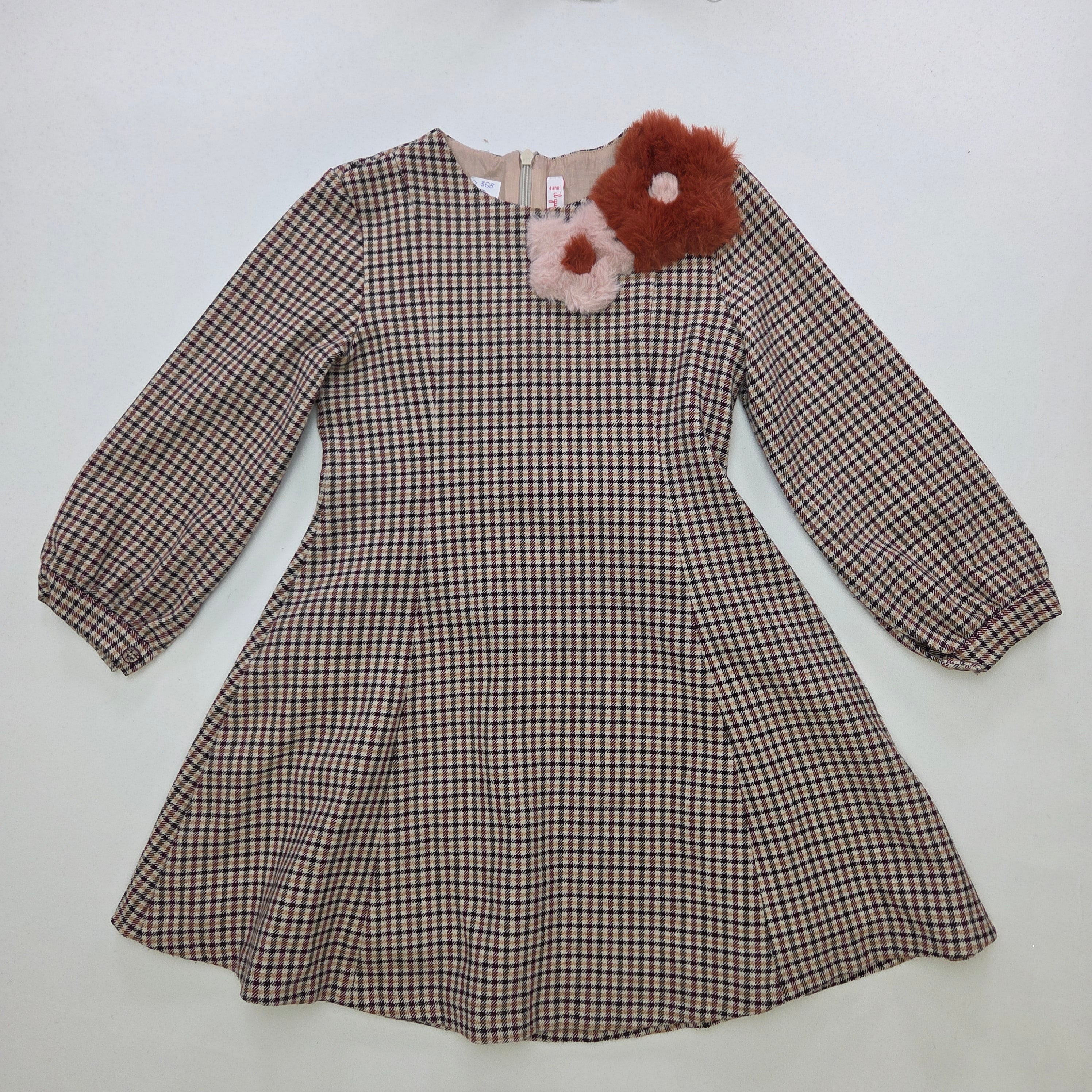 Questo adorabile vestito a quadretti è perfetto per ogni occasione! Con un taglio svasato e le maniche lunghe, regala un look elegante e giocoso. La sorpresa sta nei delicati fiori in pelliccia applicati sul davanti, che donano un tocco di originalità e stile unico. Realizzato in morbido cotone, è comodo e caldo, ideale per le fresche giornate autunnali. Nonostante sia usato, si presenta in ottime condizioni e sarà un capo versatile nel guardaroba della tua piccola, perfetto per giochi e feste!