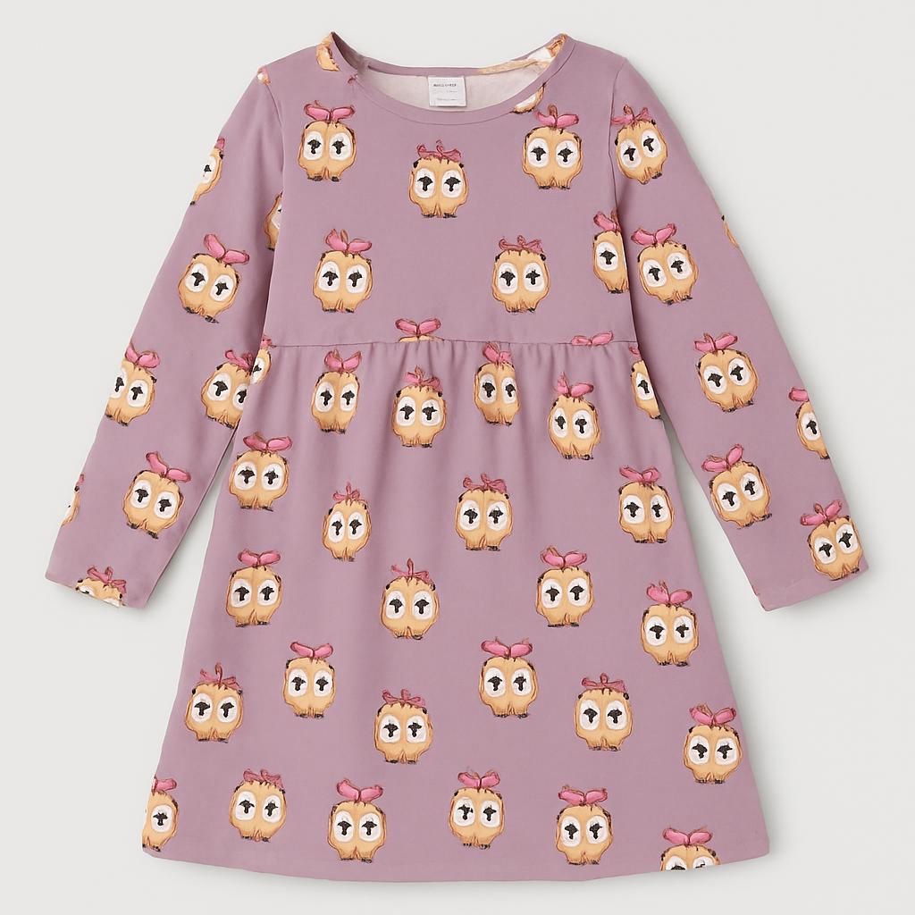 Questa adorabile vestitino lungo, realizzato in morbido cotone, conquisterà il cuore della tua piccola! Di un dolce colore lilla, è decorato con simpatici gufi dai grandi occhi espressivi e buffi fiocchi. Le maniche lunghe offrono comfort e calore, perfetto per le fresche serate primaverili. Il taglio ampio e il morbido tessuto permettono una libertà di movimento ideale per giocare e danzare. Un capo usato ma in ottime condizioni, pronto a diventare il preferito nel guardaroba delle piccole amanti dell’avventura e della fantasia!