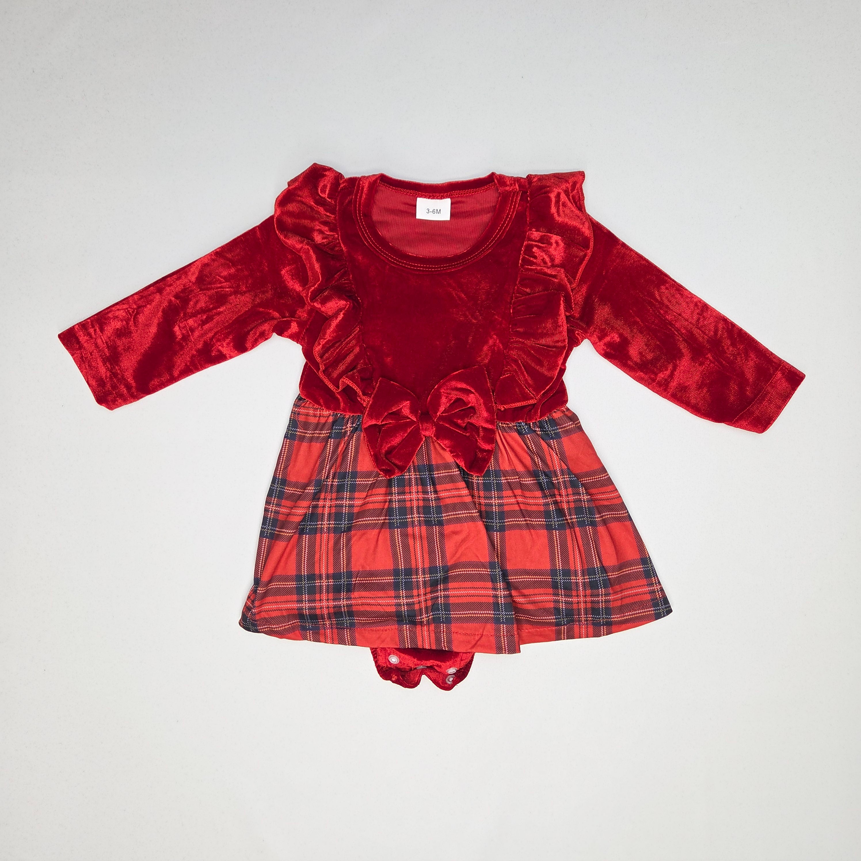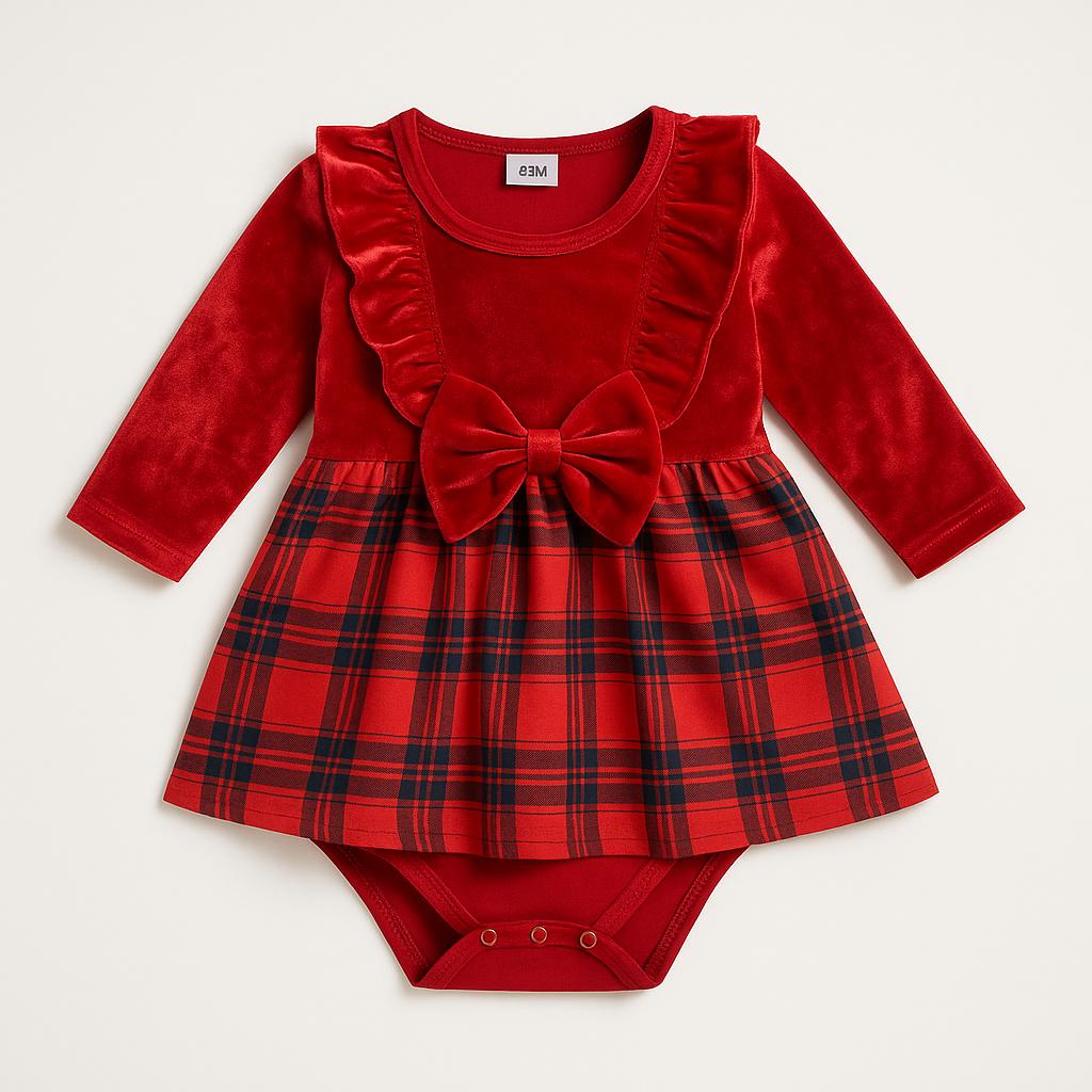 Questa adorabile tutina rossa è un vero capolavoro per le piccole fashioniste! Realizzata in velluto morbido, la parte superiore presenta fronzoli romantici e un'incantevole scollatura rotonda. La gonna, in un vivace tessuto scozzese, è impreziosita da un grande fiocco che aggiunge un tocco di eleganza. Le maniche lunghe la rendono perfetta per le occasioni speciali o le festività. Anche se usata, si trova in ottime condizioni e pronta a far brillare ogni festa! Un capo che farà sentire la tua bambina una vera principessa!