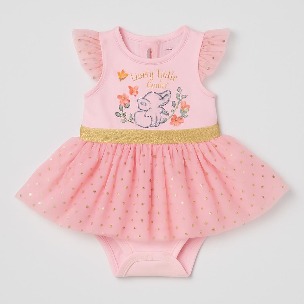 Questo adorabile vestitino per neonate è un vero sogno! Realizzato in un delicato tono rosa pastello, è abbellito da un morbido tulle con brillanti pois dorati. Le maniche a volant aggiungono un tocco di dolcezza, mentre il ricamo "lovely little one" con dolci fiori rende il tutto ancora più speciale. La vita elasticizzata in oro conferisce un tocco di eleganza, rendendo questo capo perfetto per le occasioni speciali o per un’avventura quotidiana. Anche se usato, si presenta in ottime condizioni, pronto per far brillare il guardaroba della tua piccola! Un must-have per ogni piccola principessa!