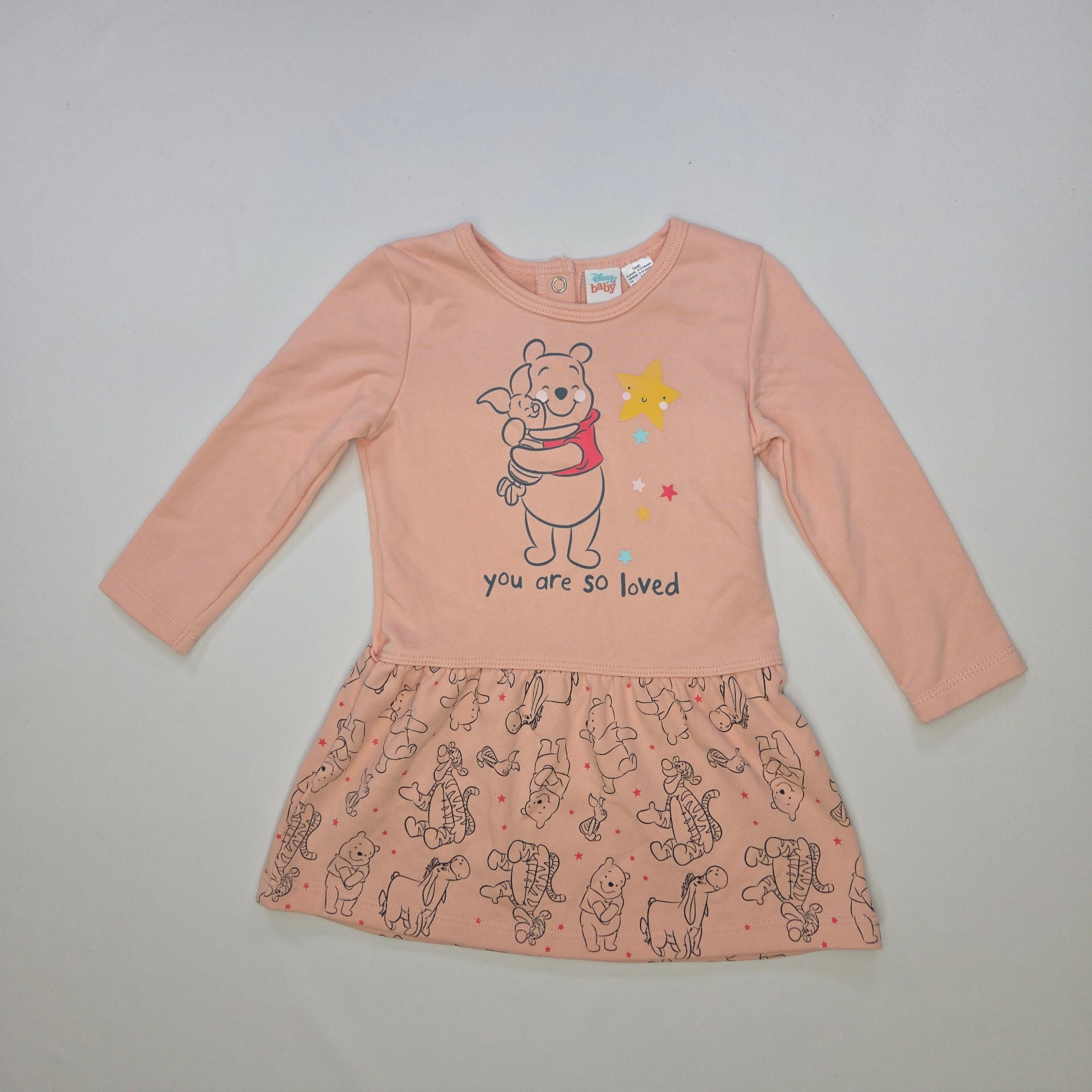 Questa adorabile vestitino di Winnie the Pooh è perfetto per le piccole sognatrici! La parte superiore in morbido cotone rosa ospita un tenero disegno del simpatico orsetto abbracciato da un dolce messaggio “you are so loved”. La gonna a palloncino, decorata con simpatici animaletti, aggiunge un tocco giocoso e divertente. Con le maniche lunghe, è ideale per le giornate più fresche. Nonostante sia un capo usato, si presenta in ottime condizioni e pronto a far sentire speciale ogni bambina. Un vestito che unisce comfort e stile, perfetto per ogni occasione!
