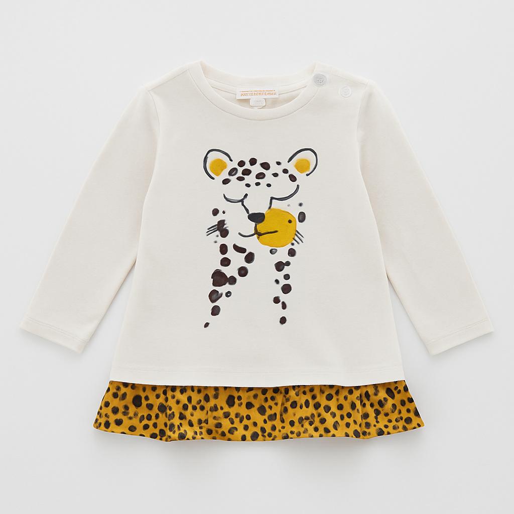 Questa adorabile maglietta a maniche lunghe è un vero colpo di fulmine per ogni piccola amante degli animali! Realizzata in cotone morbido, presenta una graziosa stampa di un leopardo sul davanti, con dettagli simpatici e colorati. La fascia inferiore in fantasia leopardata aggiunge un tocco di stile e movimento, rendendola perfetta per ogni occasione. Grazie ai bottoni sulle spalle, è facile da indossare, ideale per le avventure quotidiane. Anche se è un capo usato, si presenta in ottime condizioni e farà sicuramente felice ogni bambina! Un must-have nel guardaroba di ogni piccola fashionista!