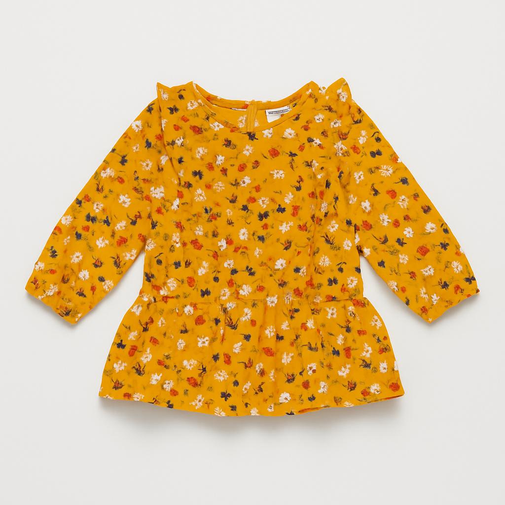 Questo adorabile vestitino giallo senape è perfetto per far brillare il guardaroba della tua piccola! Decorato con delicate floreali multicolori, aggiunge un tocco di allegria e freschezza. Le maniche lunghe, abbinate a un grazioso ruches sulle spalle, offrono un look romantico e trendy. La gonna a balze è ottima per giocare e muoversi liberamente, rendendo questo capo ideale per ogni occasione, dai pomeriggi nei parchi a feste con gli amici. Nonostante sia un pezzo di seconda mano, si presenta in ottime condizioni, pronto a far sorridere una nuova piccola fashionista!