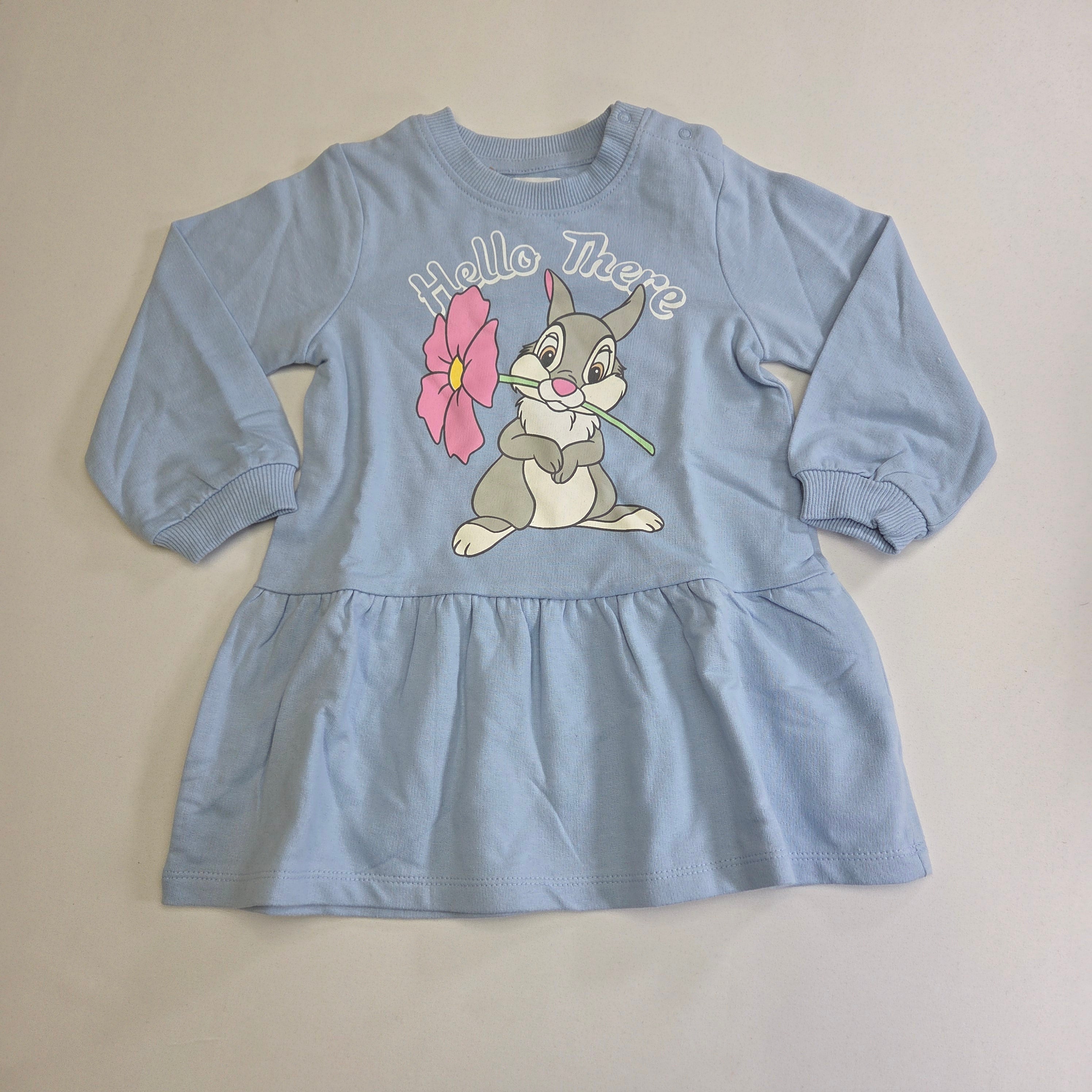 Questo adorabile abito in cotone azzurro è perfetto per le piccole sognatrici! Con una dolce stampa di un coniglietto che tiene in bocca un fiore, rende ogni giorno speciale. Le maniche lunghe e il taglio svasato lo rendono ideale per le fresche giornate primaverili. Comodo e pratico, questo vestito usato è in buone condizioni e porterà un sorriso sul viso della tua bimba, regalando un tocco di magia al suo guardaroba! Un capo da non perdere per le mini fashioniste!