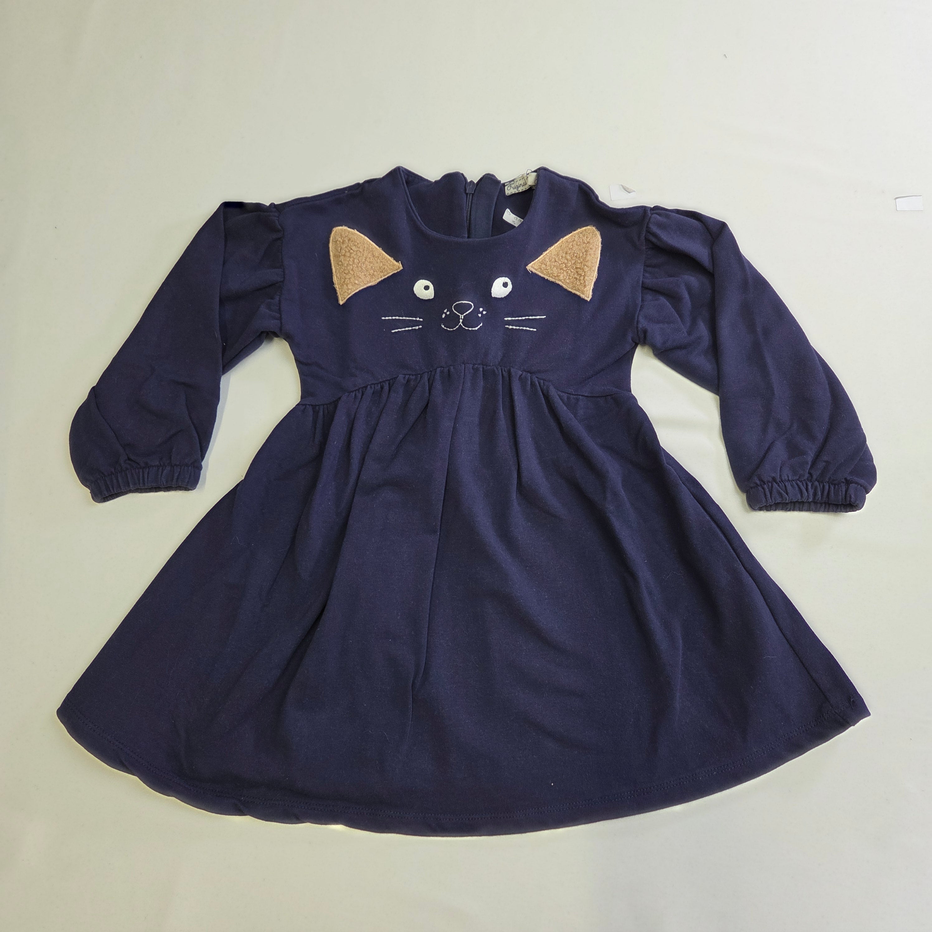 Questo adorabile vestitino in stile felino è perfetto per le piccole amanti degli animali! Realizzato in morbido cotone di un profondo blu notte, il vestito presenta una dolce applicazione a forma di viso di gatto con orecchie in feltro beige. Le maniche lunghe e la gonna ampia offrono comfort e libertà di movimento, rendendolo ideale per giochi e avventure quotidiane. L'accogliente chiusura a zip sul retro facilita l'indossamento. Nonostante sia un capo usato, è in ottime condizioni e pronto per accompagnare la tua bambina in mille avventure! Un tocco di magia felina per ogni momento!